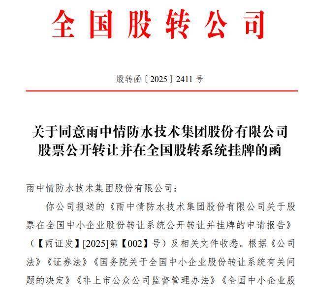 乐居财经 李兰 近日,全国股转系统公告显示,雨中情防水技术集团股份有限公司(以下简称"雨中 情")股转审核获通过,拟在新三板基础层挂牌。 2022年12月1日,雨中情首发上会,拟登陆深交所主板,但遭暂缓表决。一个多月后,2023年1月5日, 审议会议上,彼时的发审委对雨中情的应收账款增速、高毛利率合理性、业绩真实性等方面提出疑问, 最终雨中情再度首发上会未获通过。 冲击深交所主板失败后,雨中情于2025年6月30日,公司披露公开转让说明书,新三板挂牌材料被受 理。 招股书显示,雨中情主营业务为建筑防水材料的研发、生产和销售,并提供防水工程施工服务。 雨中情实际控制人为耿进玉、魏杏色、耿融。耿进玉持有西雨投资 80%的股权,魏杏色持有西雨投资 20%的股权,耿进玉和魏杏色通过西雨投资间接持有并控制公司 9952.00 万股股份,占公司股份比例为 49.76%;此外,耿进玉直接持有公司6716万股股份,占公司股份比例为33.58%;魏杏色直接持有公司 1452万股股份,占公司股份比例为7.26%;耿融直接持有公司272万股股份,占公司股份比例为1.36%。 耿进玉与魏杏色系夫妻关系,耿融系耿进玉与魏杏色之子,三人 ...