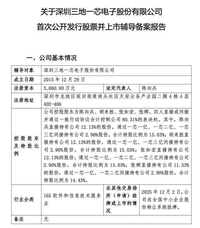 12月12日,中国证监会披露了深圳三地一芯电子股份有限公司(简称"三地一芯")首次公开发行股票并上市辅导备案报告,公 司上市辅导机构为国泰海通证券,正式迈向资本市场。 USB系列作为公司主力产品,包括USB2.0与USB3.2两大类别。USB2.0系列芯片如FC2279,具备高性能ECC纠错与低功耗设计, 在数据安全、稳定性和兼容性方面表现突出,已在细分领域建立起领先优势,创下多项行业第一。而USB3.2系列芯片支持5Gb/s 高速传输,具有耐用、兼容性强、成本可控等特点,已成为多家品牌客户高速存储方案的选择。 股权结构显示,公司控股股东为陈向兵、胡来胜、张如宏、张辉四人,其通过直接、间接持股及一致行动协议,合计控制公司 80.31%的表决权。其中,陈向兵、胡来胜、张如宏各自直接及间接持股比例均为15.03%,张辉合计持股比例为14.43%。 随着集成电路国产化进程加速,存储主控芯片作为信息产业关键环节,市场前景广阔。三地一芯此次启动上市辅导,有望借助 资本市场进一步强化研发投入、拓展产品矩阵,提升在存储芯片领域的综合竞争力。 三地一芯成立于2015年,是一家以研发、销售与服务为一体的集成电路设计企业,先后获 ...