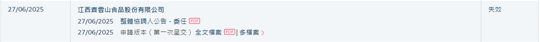 公司上市进程 - 江西齐云山食品股份有限公司于2024年6月27日向港交所递交招股书 [1] - 该招股书于2024年12月27日因满6个月而失效 [1] - 递表时的独家保荐人为中泰国际 [1] 公司业务与市场地位 - 公司是一家专注于南酸枣食品产品的知名果类零食公司 [2] - 以2024年零售额计,公司占中国南酸枣食品市场32.4%的份额,位居行业第一 [2] - 公司于1992年推出第一款南酸枣糕 [2] - 产品组合已从南酸枣糕拓展至包括四款其他南酸枣零食及其他果蔬糕 [2] 公司产品与认证 - 公司的旗舰产品南酸枣糕自1997年以来,连续28年获中国绿色食品发展中心认证为“绿色食品” [2] - 南酸枣糕于2018年获认可为国家地理标志保护产品 [2] - 公司被认定为高新技术企业及农业产业化国家重点龙头企业 [2]