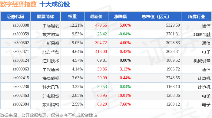 数字经济(399262)指数十大成份股详情如下: | 证券代码 | 股票简称 | 权重 | 最新价 | 涨跌幅 | 总市值(亿元) | 所属行业 | | --- | --- | --- | --- | --- | --- | --- | | sz300308 | 中际旭创 | 12.21% | 479.66 | 5.00% | | 5329.59 ) 通信 | | sz300059 | 东方财富 | 9.53% | 23.42 | -0.04% | | 3701.31 非银金融 | | sz300502 | 新易盛 | 9.05% | 304.72 | 4.00% | | 3028.83 通信 | | sz002371 | 北方华创 | 4.64% | 418.00 | 0.42% | S | 3028.31 申子 | | sz300124 | 汇川技术 | 4.57% | 69.81 | 0.00% | | 1889.52 机械设备 | | sz000063 | 中兴通讯 | 4.14% | 39.86 | 3.13% | | 1906.72 通信 | | sz002415 | 海康威视 | 3.63% | ...