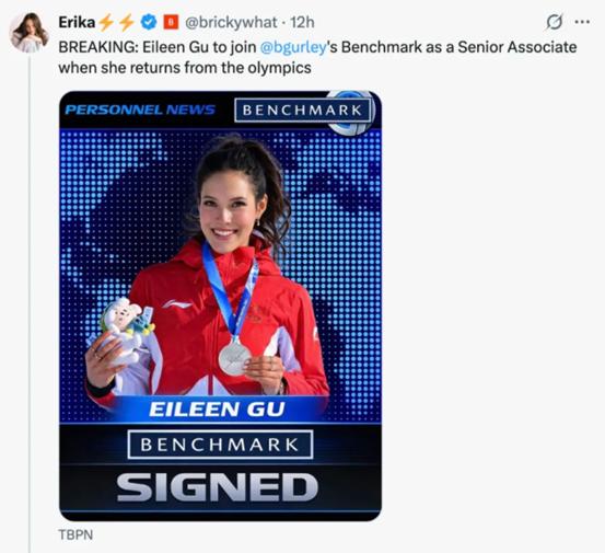 最新发声。 作者/王露 报道/投资界PEdaily 2 0 2 6创投圈第一个乌龙出现。 起因是一张截图显示,Be n c hma r k合伙人Bi l l Gu rl e y称谷爱凌将入职风投。此时正值 冬奥会关键时刻,谷爱凌本就备受瞩目。很快,国内自媒体不加证实大肆报道,轰动一 时。 今天,谷爱凌本人在小红书紧急澄清:"这不是真的"。 原来,此前流传的原图系AI捏造。 谷爱凌辟谣了 谷爱凌的成长背景,本就与风险投资并不遥远。她的母亲谷燕早年毕业于北京大学,后 赴 斯 坦 福 大 学 深 造 。 2 0 世 纪 9 0 年 代 初 进 入 华 尔 街 , 从 事 风 险 投 资 , 并 尝 试 将 风 投 理 念 引入中国市场,是国内最早一批VC从业者之一。 谷燕曾总结,做风险投资,最大的难点在"人"——既要具备科技理解能力,又要有管理 与金融运作经验;好的机制,建立在对人的判断之上。这种关于判断力、风险承担与长 期主义的认知,无形中构成了谷爱凌成长环境的一部分。 而 Be n c hma r k , 创 投 圈 并 不 陌 生 。 近 年 来 加 速 关 注 中 国 市 场 , 最 引 人 注 目 的 一 ...