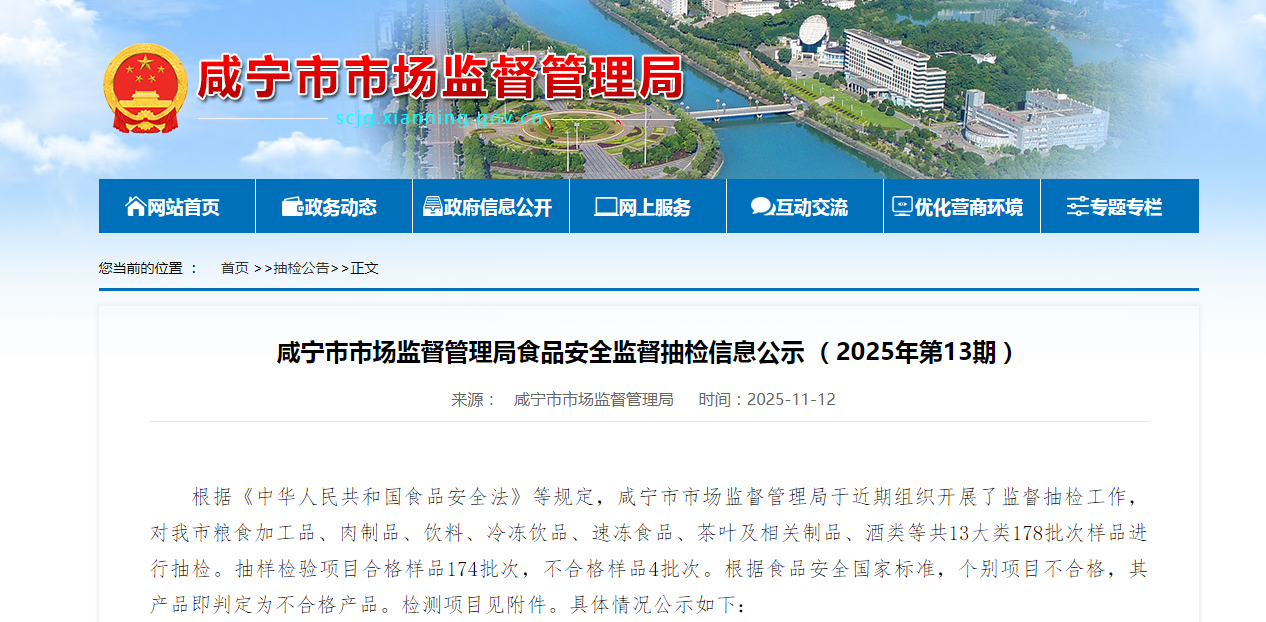 湖北省咸宁市市场监督管理局食品安全监督抽检信息公示 (2025年第13期)