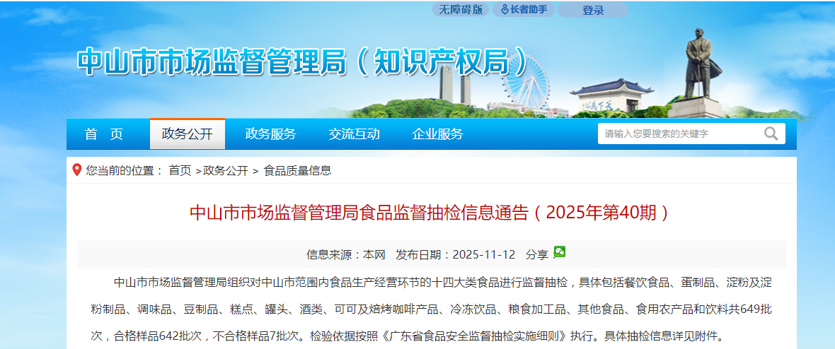 广东省中山市市场监督管理局食品监督抽检信息通告(2025年第40期)