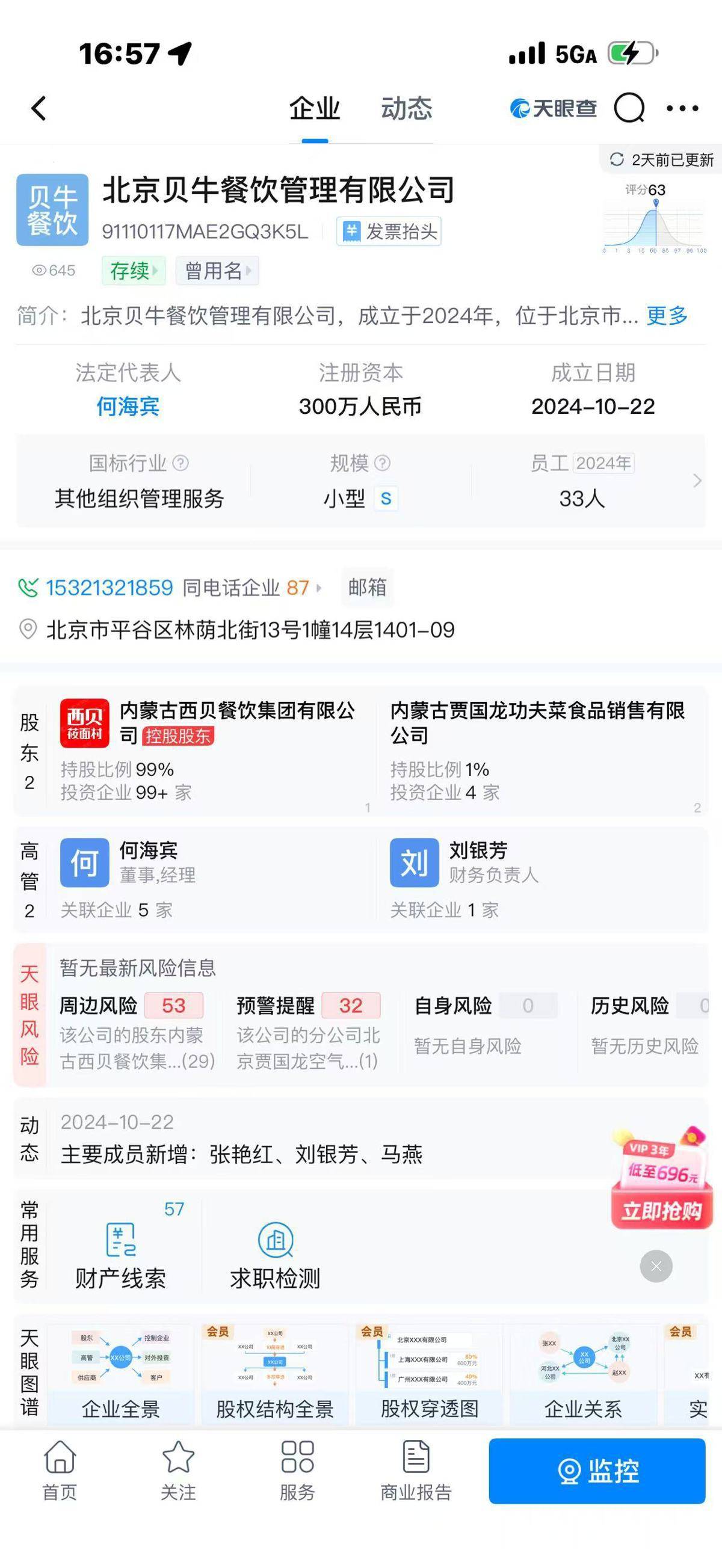 北京贝牛餐饮管理有限公司工商变更 - 公司于2024年10月成立,注册资本为300万人民币,经营范围涵盖餐饮管理、食品销售、农副产品销售等[1] - 2025年2月5日,公司名称由“北京西贝小牛餐饮管理有限公司”变更为“北京贝牛餐饮管理有限公司”[1] - 法定代表人、经理、董事由贾国龙变更为何海宾,而就在2025年1月,相关职位刚刚变更为贾国龙担任[1] - 公司由内蒙古西贝餐饮集团有限公司持股99%,内蒙古贾国龙功夫菜食品销售有限公司持股1%[1] 小米汽车用户服务政策 - 公司创始人雷军宣布,在春节期间,若小米汽车因自身故障发生抛锚,公司将提供交通与住宿费用报销[4] - 具体报销标准为1500元高铁或机票费,以及500元住宿费[4]