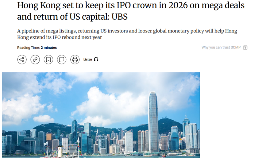 《南华早报》此前发文称,据瑞士投资银行瑞银预计,2026年香港首次公开募股(IPO)市场仍将保持全球最大筹资地的 地位,得益于巨额交易的管道和美国资本的回归。 【环球网财经综合报道】Wind数据显示,2025年港股全年IPO规模预计将达到2863亿港元,重返全球第一;港股再融 资规模则达到3166亿港元,远超2022年至2024年的规模,甚至接近过去三年的总和3181亿港元。 瑞银还预计,2026年香港将有150至200宗IPO融资超过3000亿港元(约3850亿美元),超越今年约2700亿港元的融资 额,使香港重新成为全球第一。 瑞银全球银行亚洲区覆盖部联席主管李长江(John Lee Chen-kwok)表示:"明年第一季度将有一些IPO筹集超过100亿 港元。"他还补充称,消费商品、高科技和人工智能等行业交易有望为市场带来强劲开局。 ...