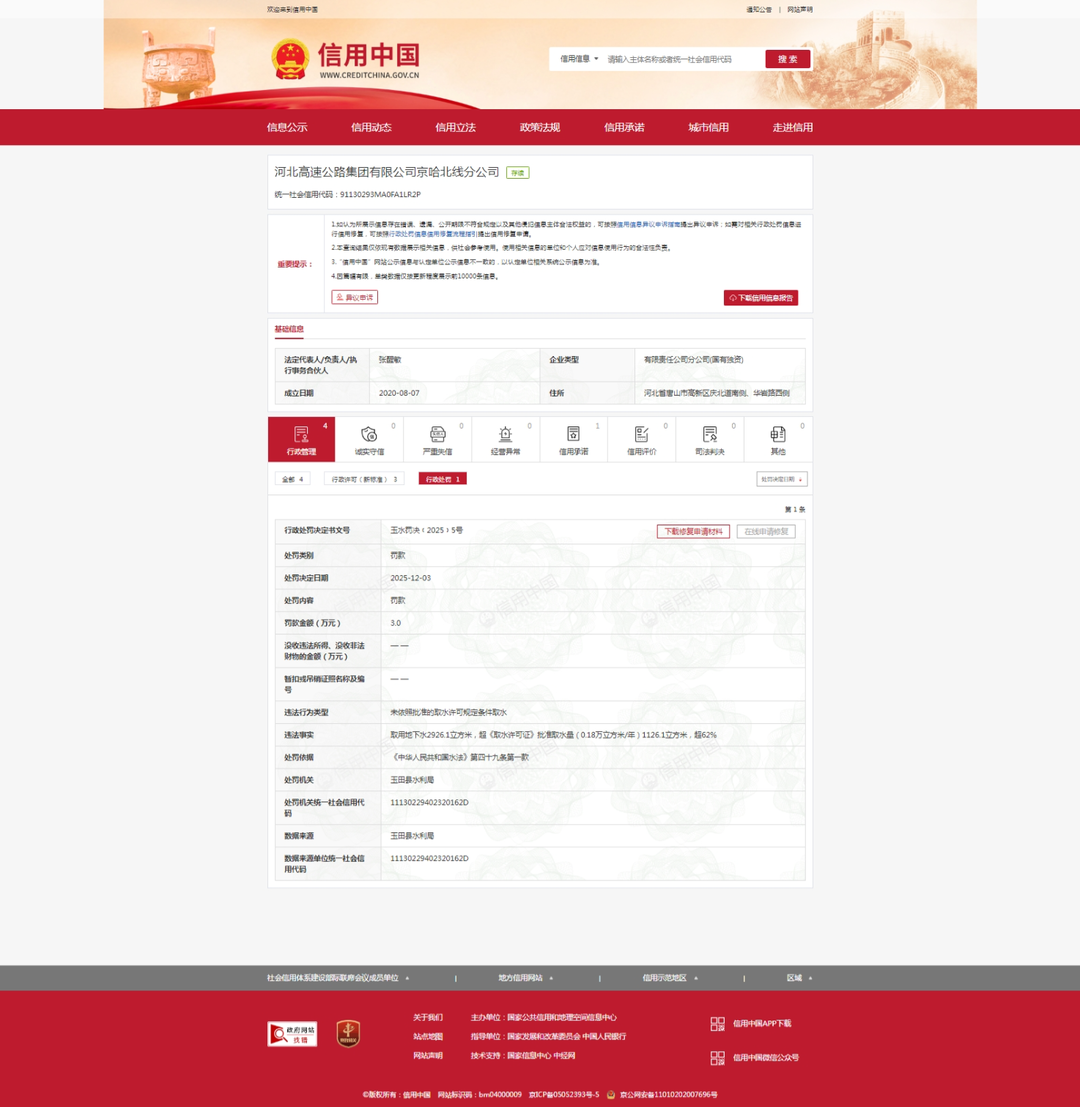 齐鲁晚报·齐鲁壹点记者于信用中国行政处罚栏获悉,12月3日,河北高速公路集团有限公司京哈北线分公司(下称"河北高速京哈北线分公司")收到3万 元罚单,处罚机关为玉田县水利局。 内容显示,河北高速京哈北线分公司的违法事实是:取用地下水2926.1立方米,超《取水许可证》批准取水量(0.18万立方米/年)1126.1立方米,超 62%。其违法行为类型为:未依照批准的取水许可规定条件取水。 对此,处罚机关依据《中华人民共和国水法》第四十九条第一款,对其罚款3万元。行政处罚决定书文号:玉水罚决﹝2025﹞5号。 据其母公司——河北高速官网介绍,公司是主要承担重大专项任务的商业类国有企业,主要运营原由省高管局管理的高速公路项目,实施政府收费高速项 目、经营性高速项目的投资、建设、管理和运营,拓展金融投资、工程建设、服务经营、生态建设、智能交通、现代物流等业务。 京哈北线分公司隶属于河北高速公路集团有限公司,主要负责G0121京秦高速公路河北省大安镇(津冀界)至下院寺枢纽互通段、S9961清东陵支线的运 营和管理工作,所辖路段全长65.949km。管辖路段位于唐山市遵化市和唐山市玉田县境内。 | 适输入企业名称、统一社会 ...