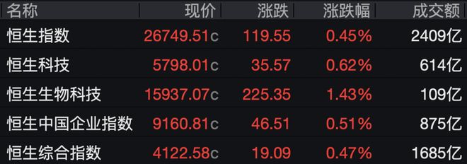 港股收评:恒生指数涨0.45%,恒生科技指数涨0.62%