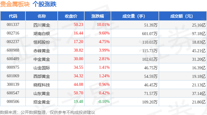| 代码 | 名称 | 主力净流入(元) | 主力净占比 游资净流入 (元) | | 游资净占比 散户净流入(元) | | 散户净占比 | | --- | --- | --- | --- | --- | --- | --- | --- | | 600489 中金黄金 | | 1.26亿 | 4.03% | 267.08万 | 0.09% | -1.28 Z- | -4.11% | | 002237 恒邦股份 | | 1.13 Z | 5.98% | -5664.59万 | -3.01% | -5591.94万 | -2.97% | | 601069 西部黄金 | | 4010.44万 | 2.09% | -1219.27万 | -0.64% | -2791.17万 | -1.46% | | 000975 山金国际 | | 3212.68万 | 1.96% | -5049.29万 | -3.08% | 1836.61万 | 1.12% | | 001337 四川黄金 | | 2138.89万 | 0.85% | -3429.18万 | -1.36% | 1290.29万 | 0.51% | | 002155 湖 ...