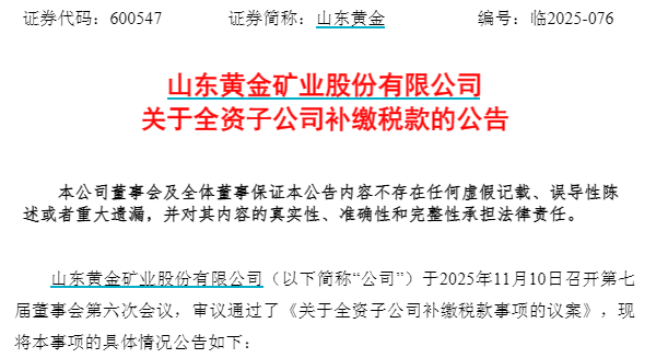 山东黄金:全资子公司莱州公司需补缴税款7.38亿元,预计将影响公司2025年度归母净利润2.3亿元
