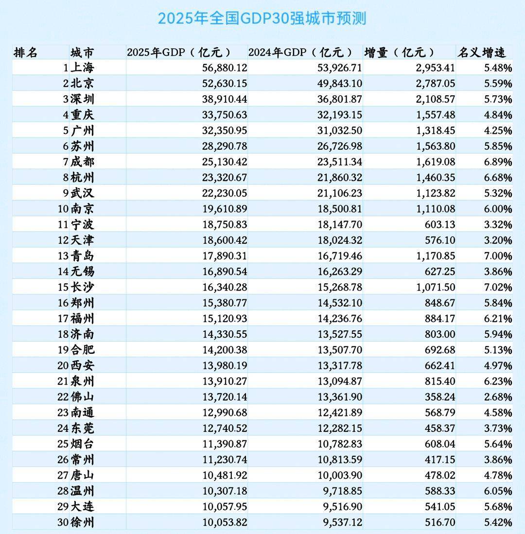 展望2025年,中国城市经济版图跃然纸上,一份预测榜单揭示了令人瞩目的发展蓝图。上海以56,880亿元的傲人经济总量稳坐头把交椅,尽显龙头风范;紧 随其后的北京亦不甘示弱,预计将达到52,630亿元。而深圳,这座充满活力的创新之都,正以38,910亿元的GDP逼近四万亿大关,位列第三。 榜单中,新一线城市如成都、杭州等展现出令人欣喜的增长速度,为中国经济注入新鲜血液。更值得关注的是,温州首次突破万亿GDP,达到10,307亿元, 标志着区域经济发展迎来了新的里程碑,也预示着中国经济发展更加均衡。此外,福州正奋力追赶郑州,二者差距不断缩小,也暗示着东部沿海城市群的崛 起。 | | 2025年全国GDP30强城市预测 | | | | | --- | --- | --- | --- | --- | | 城市 排名 | | 2025年GDP(亿元) 2024年GDP(亿元) 增量(亿元) | | 名义增速 | | 1上海 | 56,880.12 | 53,926.71 | 2,953.41 | 5.48% | | 2北京 | 52,630.15 | 49,843.10 | 2,787.05 | 5.59% | | 3 ...