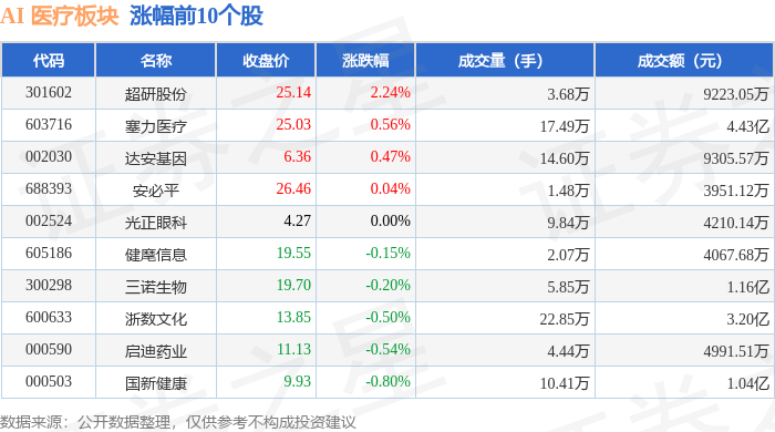 从资金流向上来看,当日AI 医疗板块主力资金净流出2.9亿元,游资资金净流入1.34亿元,散户资金净流 入1.55亿元。AI 医疗板块个股资金流向见下表: | 代码 | 名称 | 主力净流入(元) | 主力净占比 游资净流入 (元) | | 游资净占比 散户净流入 (元) | | 散户净占比 | | --- | --- | --- | --- | --- | --- | --- | --- | | 603716 塞力医疗 | | 2790.65万 | 6.29% | -2122.14万 | -4.79% | -668.51万 | -1.51% | | 300451 | 创业慧康 | 1365.69万 | 10.22% | 82.11万 | 0.61% | -1447.80万 | -10.83% | | 301602 超研股份 | | 937.98万 | 10.17% | -104.08万 | -1.13% | -833.90万 | -9.04% | | 600850 | 电科数字 | 392.83万 | 0.55% | 2621.57万 | 3.65% | -3014.40万 | -4.20% | | 300 ...