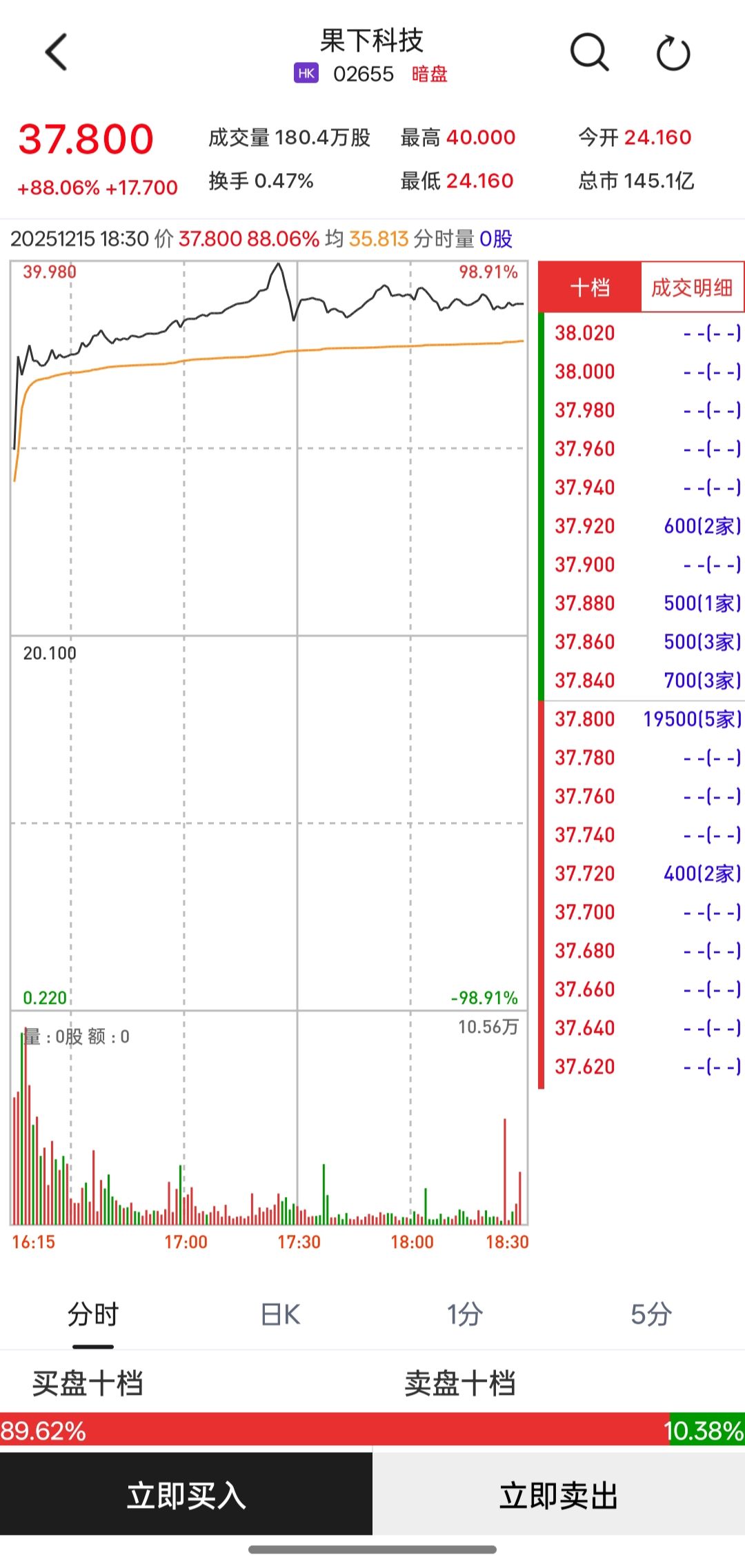- -(- -) 37.620 mbuillialilin III mi minilliamli 16:15 17:30 18:30 18:00 17:00 1分 5分 स्त्र संस्क 日K 买盘十档 卖盘十档 89.62% 10.38% 立即买入 立即卖出 • 行情来源: 利弗莫尔证券 o AI互联网储能龙头+AI机器人安全第一股果下科技(02655)将于2025年12月16日(星期二)在香港挂牌。截至收盘,利弗莫尔证券暗盘交易显示报价37.80港 元,较招股价20.10港元上涨88.06%,每手100股,不计手续费,每手赚1770港元。 ...