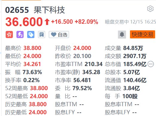 消息面上,果下科技公开发售据悉录得超1800倍超额认购,金额超1300亿港币,成为今年港股新股AI 机器人安全领域超购王。VanCapital、Schonfeld、Symmetry、InfiniCapital等全球知名长线基金积极参 与。 | 02655 果下科技 | | | | --- | --- | --- | | 36.600 ↑ +16.500 +82.09% 暗盘交易中 12/15 16:25 | | | | * % 2 月 ♥ 白选 | 快捷交易 | | | 最高价 38.800 | 开盘价 24.000 | 成交量 84.85万 | | 最低价 24.000 | 昨收价 20.100 | 成交额 2907.1万 | | 平均价 34.261 | 市盈率TTM 210.34 总市值 185.49亿 (1) | | | 振 幅 73.63% | 市盈率(静) 345.28 总股本 5.07亿 | | | 换手率 0.22% | 市净率 56.481 | 流通值 140.46亿 | | 52周最高 38.800 | 委 比 79.52% | 流通股 3.84亿 | | 52周最低 24.000 | 量 ...