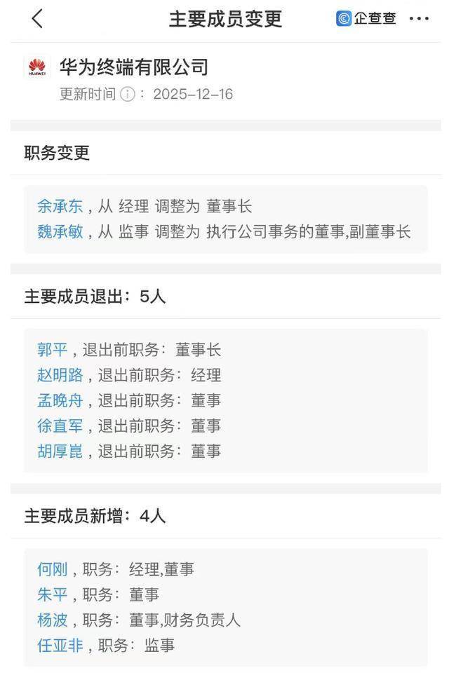 瑞财经 吴文婷12月16日,据企查查及国家企业信用信息公示系统,华为终端有限公司发生工商变更。 其中,郭平卸任董事长,由余承东接任,孟晚舟、徐直军等卸任董事,另有多位高管发生变更。 华为终端有限公司成立于2012年11月,注册资本6.06亿元,法定代表人为魏承敏,经营范围包括:开 发、生产、销售通信及电子产品、计算机、卫星电视接收天线、高频头、数字卫星电视接收机及前述产 品的配套产品,并提供技术咨询和售后服务等。 股东信息显示,目前,该公司由华为终端(深圳)有限公司100%持股。而后者由华为投资控股有限公 司、华为技术有限公司分别持股67.95%、32.05%。 ...