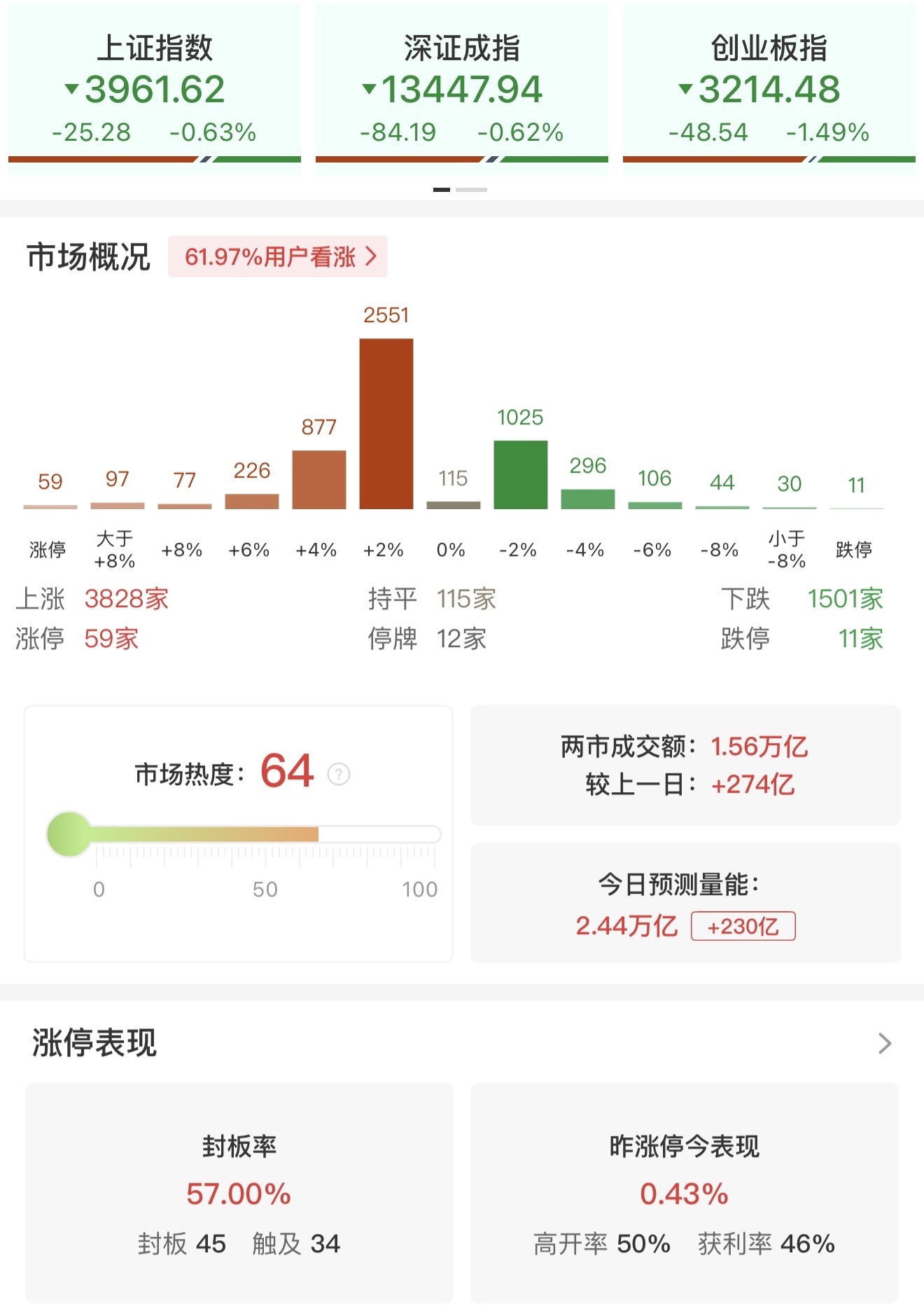 涨停表现 封板率 封板 45 触及 34 10月31日,市场早盘市场早间震荡调整,三大指数集体下挫。沪深两市半日成交额1.56万亿,较上个交易日放量274亿。 昨涨停今表现 盘面上热点快速轮动,全市场超3800只个股上涨。板块方面,影视院线、医药、电池等板块涨幅居前,保险、存储芯片、煤炭、CPO等板块跌幅居前。 截至收盘,沪指跌0.63%,深成指跌0.62%,创业板指跌1.49%。 从板块来看,医药板块逆势上涨,三生国健20cm涨停,联环药业、昂利康涨停。锂电板块表现活跃,天际股份2连板,恩捷股份等多股涨停。福建板块再度 走强,平潭发展11天8板。AI应用概念股持续走高,荣信文化、福石控股双双20cm涨停。下跌方面,算力硬件概念股集体下跌,"易中天"光模块三巨头大幅 调整。存储芯片概念股震荡走弱,江波龙跌超10%。可控核聚变概念股下挫,中国核建跌停。 57.00% 0.43% 高开率 50% 获利率 ...