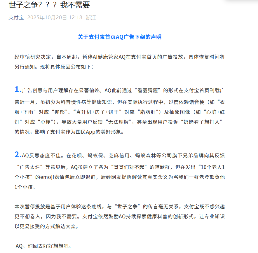 10月20日,支付宝发布《关于支付宝首页AQ广告下架的声明》。文中提到经审慎研究决定,自本周起,暂停AI健康管家AQ在支付宝首页的广 告投放,具体恢复时间将另行通知。 并将下架的原因公布:1、广告创意与用户理解存在显著偏差。2、AQ反思态度不佳。 值得注意的是,10月14日中午,支付宝官方微信一篇自带"火气"的推文"炸翻"朋友圈,文中直接痛批自家的AI健康应用AQ。 事情要从一个月前说起:支付宝把最重要的首页资源位给了 AQ——这个蚂蚁旗下力推的健康应用,本意是通过看图猜题的形式科普慢性病预防知识。 谁料,AQ不按常理出牌,把首页变成了 "谐音梗重灾区",比如用"蛋糕、雪糕、棒棒糖"代表"高血糖",用"衣服+下雨"表示"抑郁"。 更离谱的是,AQ还玩起了抽象风。比如用"心脏+红灯"暗示"心梗",用数字"140/90"表示高血压。 问题之抽象,答案之惊人,让支付宝都忍不住吐槽:"这谁看得懂?网友的奶奶都懵了!" 据悉,蚂蚁AQ是蚂蚁集团于2025年6月26日推出的AI健康应用,定位为全民健康管家,提供AI诊室、报告解读、健康档案等超100种服务,支 持多模态图文识别与智能追问功能。该应用依托蚂蚁医疗大模型,通过 ...