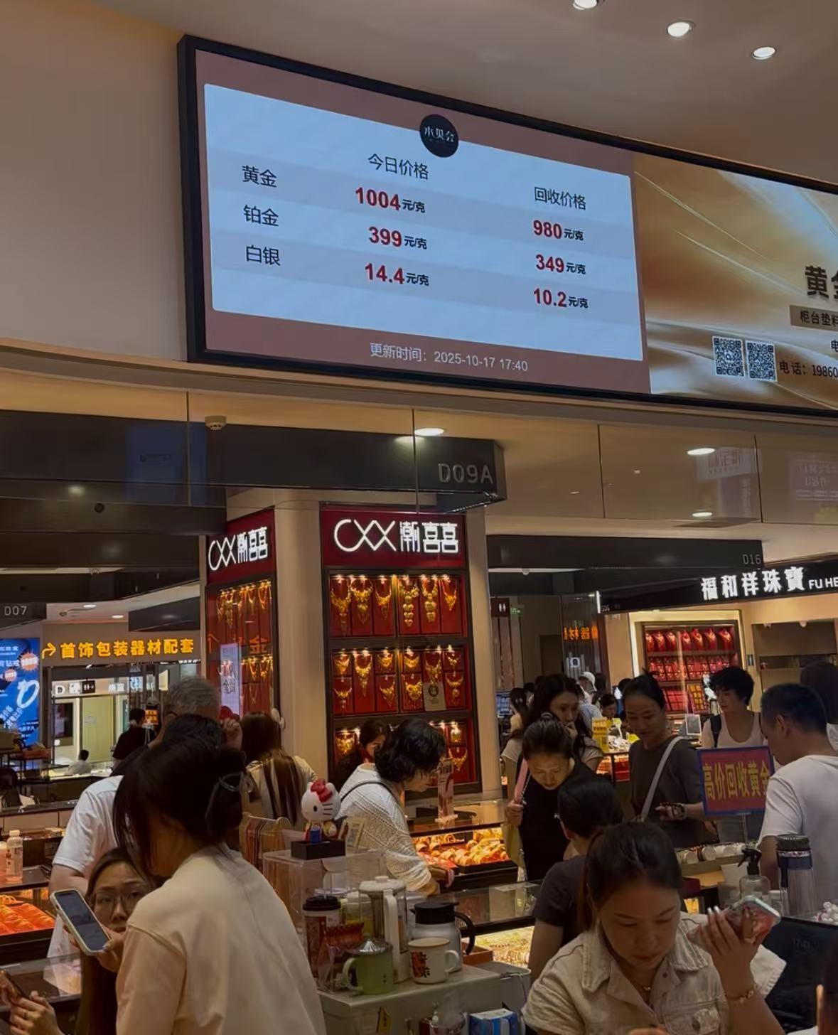 记者丨张晓慧 编辑丨孙超逸 视频编辑丨许婷婷 10月17日,黄金价格再创新高,上海黄金交易所AU99.99早盘价报990.35元/克,午盘价已升至998.8元/克,日内多次突破千元关口。 深圳水贝迎来千元金价,当日下午,水贝足金报1004元/克,回收价报980元/克。 黄金各类投资火热,萃华珠宝集团总经理、黄金理财投资分析师柳玉荣在接受21世纪经济报道采访时表示,当前黄金价格突破新高,受到地缘政治、央行 增持等多个因素影响,应警惕黄金价格回落;同时,黄金本身作为"零息资产",投资者更应谨慎配置,按需购金。 17日晚间,国际金价出现跳水,现货黄金最新报价4251.448美元/盎司,当天盘中一度跌穿4200美元。 (摄/张晓慧) 尽管金价屡破新高,21世纪经济报道记者线下走访看到,水贝黄金专业市场内依然有不少购买金饰、投资金条的消费者。 当天,周大福、周生生、老庙黄金等品牌足金饰品每克报价在1280元左右,老铺黄金发布公告,将在10月26日进行年内第三次调价。 | 10.17 | 周大福 | 1279元/克 | 持平 | | --- | --- | --- | --- | | 10.17 | 周生生 | 1281 ...