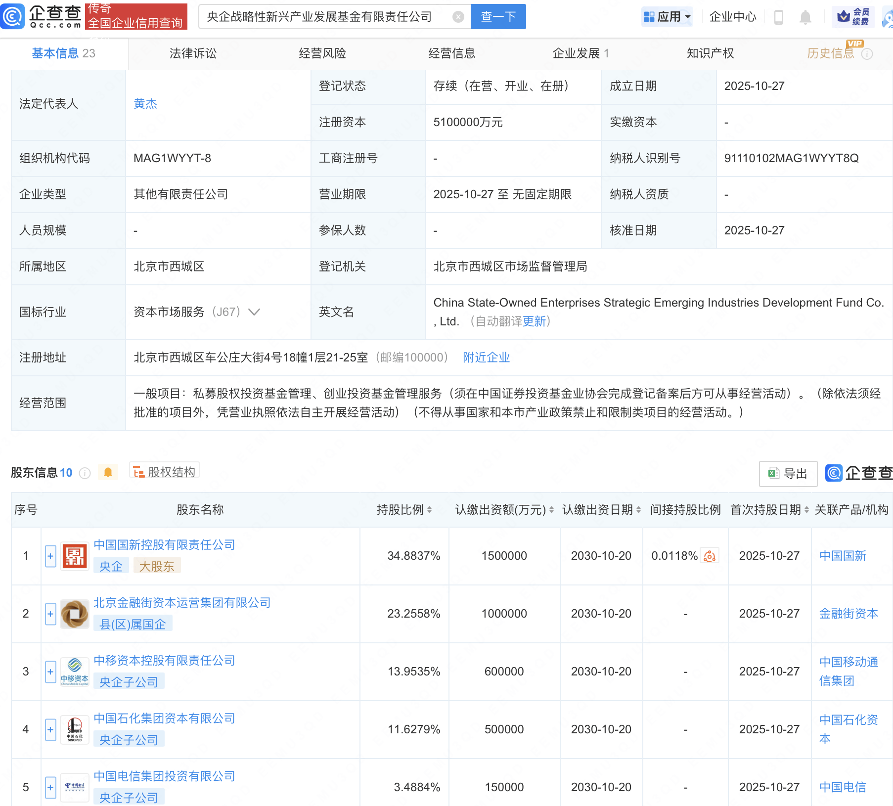 企查查APP显示,近日,央企战略性新兴产业发展基金有限责任公司成立,法定代表人为黄杰,注册资本510亿人民币,经营范围为私募股权投资基金管 理、创业投资基金管理服务。企查查股权穿透显示,该公司由中国国新控股有限责任公司、中移资本控股有限责任公司、中国石化集团资本有限公司、中国 电信集团投资有限公司等共同持股。 | 全国企业信用查询 | | 央企战略性新兴产业发展基金有限责任公司 | (x) 查一下 | | --- | --- | --- | --- | | 基本信息 23 | 法律诉讼 | 经营风险 | 经营信息 | | 法定代表人 | 黄杰 | 登记状态 | 存续(在营、开业、; | | | | 注册资本 | 5100000万元 | | 组织机构代码 | MAG1WYYT-8 | 工商注册号 | l | | 企业类型 | 其他有限责任公司 | 营业期限 | 2025-10-27 至 无固灵 | | 人员规模 | | 参保人数 | | | 所属地区 | 北京市西城区 | 登记机关 | 北京市西城区市场监 | | 国标行业 | 资本市场服务(J67)∨ | 英文名 | China State-Owned I , ...
