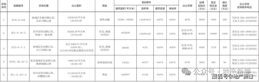 今天,西安推出5宗地块集中出让,合计出让地块面积104.13亩。其中,住宅商服用地2宗,商务金融用地1宗,体育场馆用地1宗,商业用地1宗。主要分 布在幸福林带板块2宗,经开区2宗,航天基地1宗。 | 宗地 序号 | 地籍编号 | 宗地位置 | 出让面积 | 用途 | 规划条件 | | | | 出让年限 | 挂牌 起始价 | 亮买 保证金 | 増价 根直 | 出让宗地 咨询联系电话 | | --- | --- | --- | --- | --- | --- | --- | --- | --- | --- | --- | --- | --- | --- | | | | | | | 建筑面积(平方米) | 启积率 | 建筑密度 | 绿地率 | | (万元) | (万元) | (万元) | | | | XC4-9-158 | 新城区幸福中路以东。 长连中图(含量 | 13649.92 平方米 (20.475 前) | 直务会融 | 16380- 68250 | 12≤R≤5.0 | ≤50% | ≥25% | 40年 | 9500 | 1900 | 290 | 马先生 029-83276707 王女士029-6132 ...