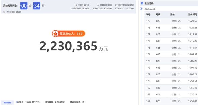地块基本信息 - 地块位于天河区黄埔大道以南、马场路以东,即马场1期地块,是广州珠江新城最后一块“宝地” [1] - 地块用地面积约19.45万平方米,包含商业、商务、居住、中小学、服务设施等多种性质用地 [1] - 地块挂牌起始价为186.44亿元 [1] 竞价过程与结果 - 地块于2026年2月25日上午10时正式进入限时竞价环节 [1] - 竞价过程激烈,截至下午4点26分,历经180轮报价 [1] - 最终报价突破223.03亿元,为2026年内目前为止总价最高地块 [1] - 该成交总价成功位列广州宅地成交总价第二名 [1] - 竞价增价幅度为2,000万元 [2] - 最高出价人号牌为828 [2]
