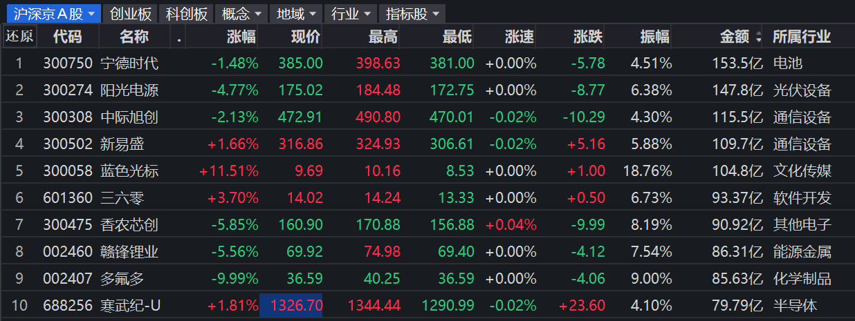 市场全天震荡调整,三大指数低开低走,沪指、深成指盘中跌超1%。盘面上,市场热点较为杂乱,全市场超4100只个股下跌。截至收盘,沪指跌0.81%,深 成指跌0.92%,创业板指跌1.16%。 从板块来看,AI应用概念逆势上涨,榕基软件、浪潮软件、宣亚国际、华胜天成2连板。 半导体概念表现活跃,圣晖集成、龙迅股份涨停。 机器人概念股局部走强,首开股份5天3板。 沪深两市成交额合计1.93万亿元,较上一交易日放量约152.77亿元。其中,沪市成交额7909.49亿元,深市成交额1.14万亿元。 宁德时代成交额居首,为153.5亿元。其后是阳光电源、中际旭创、新易盛、蓝色光标,成交额分别为147.8亿元、115.6亿元、109.7亿元、104.8亿元。 | 沪深京A股▼|创业板|科创板|概念▼ 地域▼ 行业▼ 指标股▼ | | | | | | | | | --- | --- | --- | --- | --- | --- | --- | --- | | 还原 代码 名称 . | | 涨幅 现价 | | 最高 最高 最低 涨速 | 涨跌 | 振幅 | 金额 | | 1 300750 宁德时代 | | -1.48% 38 ...