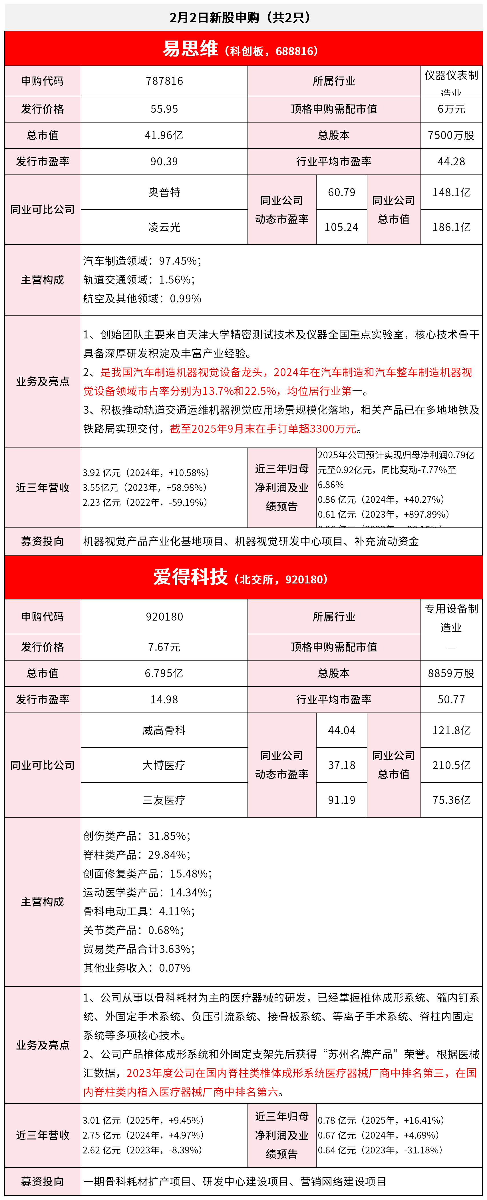 易思维 (科创板,688816) 核心信息 - 公司于2月2日进行新股申购,申购代码787816 [1][2] - 发行总市值为41.96亿元 [2] - 发行市盈率为90.39倍 [2] 易思维 业务与市场地位 - 公司是我国汽车制造机器视觉设备龙头,在2024年汽车制造机器视觉设备领域市占率为13.7%,在汽车总装机器视觉设备领域市占率为22.5%,均位居行业前列 [2] - 公司创始团队主要来自天津大学精密测试技术及仪器专业,具备深厚研发积淀及丰富产业经验 [2] - 公司积极推动轨道交通运维机器视觉应用场景,产品已在多个铁路局实现交付,截至2025年9月末在手订单超3亿元 [2] - 公司主营构成高度集中于汽车制造领域,占比达97.45%,轨道交通领域占比1.56%,航空及其他领域占比0.99% [2] 易思维 财务表现 - 2024年营收为3.92亿元,同比增长10.58% [3] - 2023年营收为3.55亿元,同比增长58.98% [3] - 2022年营收为2.23亿元,同比下降59.19% [3] 易思维 募资用途 - 募集资金投向机器视觉产品产业化基地项目、机器视觉研发中心项目 [3] 爱得科技 (北交所,920180) 核心信息 - 公司于2月2日进行新股申购,申购代码920180 [3] - 发行价格为7.67元,发行总市值为6.795亿元 [3] - 发行市盈率为14.98倍 [3] 爱得科技 业务与产品构成 - 公司从事以骨科耗材为主的医疗器械的研发、生产与销售 [4] - 公司产品线覆盖创伤类、脊柱类、创面修复类、运动医学类及关节类产品 [3][4] - 具体主营构成:创伤类产品占比31.85%,脊柱类产品占比29.84%,创面修复类产品占比15.48%,运动医学类产品占比14.34%,关节类产品占比0.68%,贸易类产品合计占比3.63%,其他业务收入占比0.07% [3][4] - 公司产品椎体成形系统和外固定支架先后获得相关认证,根据2023年度数据,公司在国内脊柱类椎体成形系统市场排名第六 [4] 爱得科技 财务表现 - 2025年营收为3.01亿元,同比增长9.45% [4] - 2024年营收为2.75亿元,同比增长4.97% [4] - 2023年营收为2.62亿元,同比下降8.39% [4] 爱得科技 募资用途 - 募集资金投向骨科耗材扩产项目、研发中心建设项目、营销网络建设项目 [4]