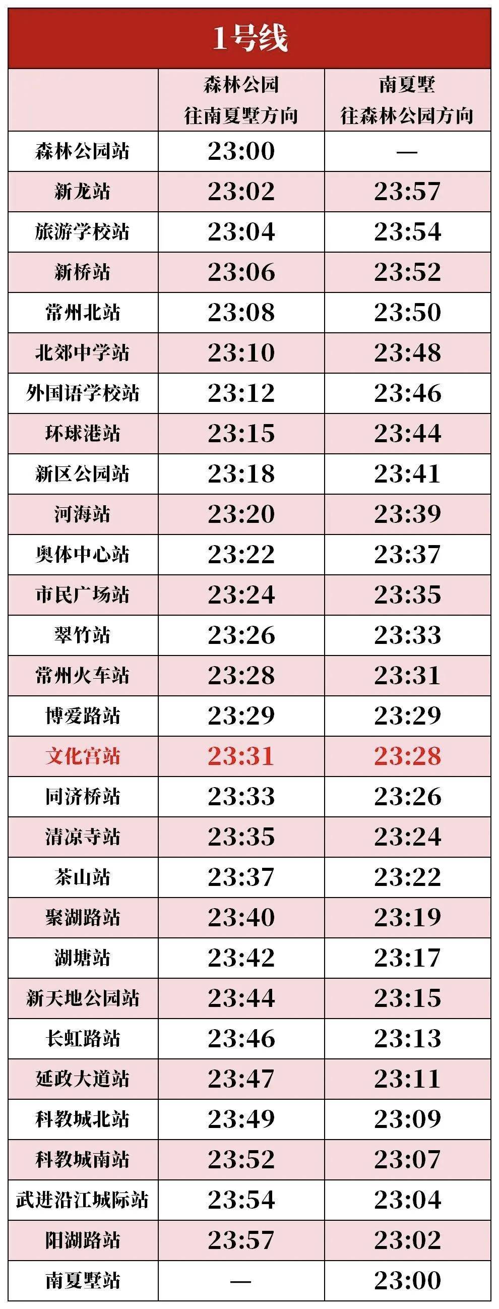 1号线各站末班车时刻表 9月30日至10月8日,常州地铁1、2号线均延长运营半小时,1号线末班车延长至23:00,2号线末班车延长至22:30,双线延运期间行车间隔均为15分钟。 | 1号线 | | | | --- | --- | --- | | 森林公园 | | 南夏野 | | 往南夏野方向 | | 往森林公园方向 | | 森林公园站 | 23:00 | | | 新龙站 | 23:02 | 23:57 | | 旅游学校站 | 23:04 | 23:54 | | 新桥站 | 23:06 | 23:52 | | 常州北站 | 23:08 | 23:50 | | 北郊中学站 | 23:10 | 23:48 | | 外国语学校站 | 23:12 | 23:46 | | 环球港站 | 23:15 | 23:44 | | 新区公园站 | 23:18 | 23:41 | | 河海站 | 23:20 | 23:39 | | 奥体中心站 | 23:22 | 23:37 | | 市民广场站 | 23:24 | 23:35 | | 翠竹站 | 23:26 | 23:33 | | 常州火车站 | 23:28 | 23:31 | | ...