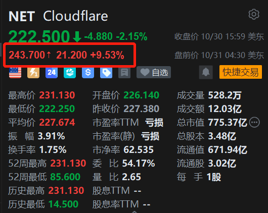 | NET Cloudflare | | | | --- | --- | --- | | 222.500 ↓ -4.880 -2.15% | | 收盘价 10/30 15:59 美东 | | 243.700 ↑ 21.200 +9.53% | | 盘前价 10/31 04:30 美东 | | 三 7 24 字 S 9 日 ♥ 白 一 白选 | | ● 快捷交易 | | 最高价 231.130 | 开盘价 226.140 | 成交量 528.2万 | | 最低价 222.250 | 昨收价 227.380 | 成交额 12.03亿 | | 平均价 227.674 | 市盈率TM 亏损 | 总市值 775.37亿 … | | 振 幅 3.91% | 市盈率(静) 亏损 | 总股本 3.48亿 | | 换手率 1.75% | 市净率 62.535 | 流通值 671.94亿 | | 52周最高 231.130 | 委 比 54.17% | 流通股 3.02亿 | | 52周最低 85.600 | 量 比 2.65 | 每 手 1股 | | 历史景高 231.130 | 股息TTM -- | | | 历史最低 14. ...