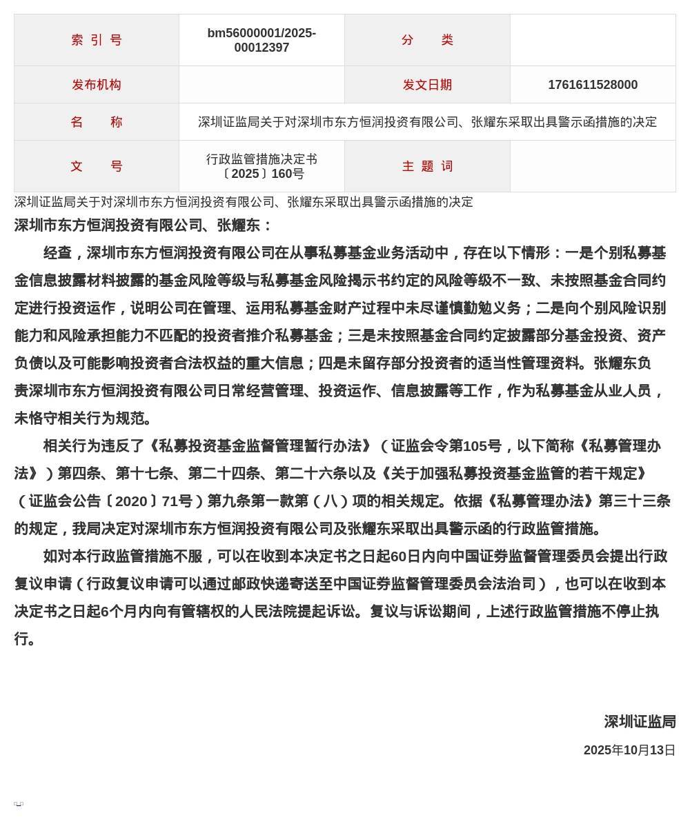 决定显示,深圳市东方恒润投资有限公司在从事私募基金业务活动中,存在以下情形:一是个别私募基金信息披露材料披露的基金风险等级与 私募基金风险揭示书约定的风险等级不一致、未按照基金合同约定进行投资运作,说明公司在管理、运用私募基金财产过程中未尽谨慎勤勉义 务;二是向个别风险识别能力和风险承担能力不匹配的投资者推介私募基金;三是未按照基金合同约定披露部分基金投资、资产负债以及可能 影响投资者合法权益的重大信息;四是未留存部分投资者的适当性管理资料。 张耀东负责深圳市东方恒润投资有限公司日常经营管理、投资运作、信息披露等工作,作为私募基金从业人员,未恪守相关行为规范。 以上行为违反了《私募投资基金监督管理暂行办法》《关于加强私募投资基金监管的若干规定》的相关规定。 针对以上问题,深圳证监局决定对深圳市东方恒润投资有限公司及张耀东采取出具警示函的行政监管措施。 | 索 引 号 | bm56000001/2025- 00012397 | 分 类 | | | --- | --- | --- | --- | | 发布机构 | | 发文日期 | 1761611528000 | | 称 ਸ | | 深圳证监局关于对深圳市东方恒润 ...