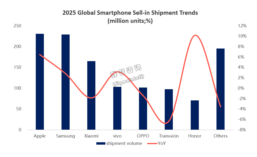 全球智能手机市场概况 - 2025年全球智能手机出货量约为12.0亿部,同比增长1.0% [1] - 行业正从“规模比拼”迈入“价值深耕”的新常态,增长乏力背后是成本压力驱动的价格带分化、品牌格局重塑与竞争逻辑升级 [1] - 存储价格高位运行引发成本压力,推动行业加速产品结构与供应链策略的优化升级 [1] 全球市场竞争格局与厂商表现 - 高端机型成为拉动全球市场的核心引擎 [2] - 苹果2025年全球出货量约2.31亿部,同比增长6.5%,其通过签订长期协议提前锁定核心物料价格与供应,形成显著供应优势 [2] - 三星2025年全球出货量约2.30亿部,同比增长2.8%,依托自研存储、套片的全产业链布局有效降低供应链风险 [2] - vivo与OPPO全球出货量基本稳定,分别约为1.04亿部和1.02亿部,依托核心产业集群优势实现供应链快速响应与成本精细化管控 [2] - 传音2025年全球出货量约0.98亿部,同比减少6.3%,其中第四季度出货量约2170万部,同比减少20.0%,主因其中低端机型利润微薄,对存储涨价成本高度敏感 [3] 中国智能手机市场概况与竞争 - 2025年中国国内智能手机出货量约为2.8亿部,同比微降0.2% [1][6] - 头部品牌凭借高性价比产品与可观促销策略挤压其他品牌,导致其他品牌高端化转型受限,中低端市场利润承压 [6] - 华为2025年国内出货量约4690万部,登顶国内市场榜首,其下半年通过下调Mate 80系列起售价的高竞争力定价策略有效拉动市场 [6] - 苹果2025年国内出货量约4680万部,同比增长8.8%,凭借产品、定价、供应链、渠道、生态与竞争格局六大核心要素协同发力 [6] - vivo 2025年国内出货量约4640万部,其中第四季度出货量约1190万部,依托中高端机型发布、年末大促及库存清库完毕等利好稳居市场前列 [7] - 2025年中国市场前五大厂商及份额为:华为(16.7%)、苹果(16.6%)、vivo(16.5%)、小米(15.6%)、OPPO(15.5%),“其他”厂商份额为19.1% [8] 行业后市展望与趋势 - 据预测,2026年全球智能手机整机出货量约11.4亿部,同比下滑4.4% [9] - 2026年中国国内智能手机出货量预计为2.64亿部,同比下滑6.0% [10] - 存储价格高位运行态势预计延续,成本压力持续传导,将倒逼厂商优化产品结构、提升运营效率,中低端机型可能选择存储降配或放缓平台升级 [9] - 部分终端厂商的存储长期布局策略,可能从传统模组采购转向核心原材料备货 [9] - 生态竞争已成为行业核心赛道,华为鸿蒙、苹果iOS的生态壁垒持续筑牢,行业竞争逻辑从硬件参数比拼转向跨设备体验与服务能力的综合较量 [9]