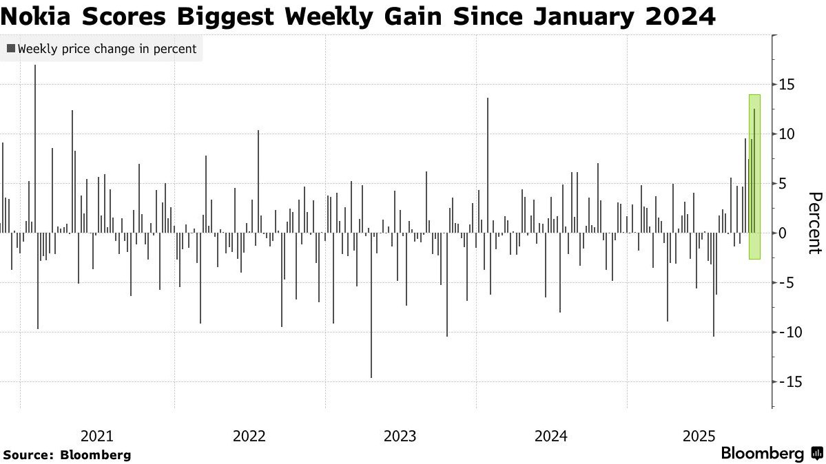 智通财经APP获悉,诺基亚(NOK.US)本周的强劲上涨,凸显出这家5G设备制造商和昔日手机巨头正成为欧洲人工智能领域的重要标的。在英伟达 (NVDA.US)同意以10亿美元入股这家芬兰公司后,诺基亚股价有望创下自2024年1月以来最大单周涨幅,并迎来2013年以来表现最佳的一个月。根据合作内 容,英伟达的芯片将用于加速诺基亚现有5G及下一代6G网络的软件开发。 花旗集团分析师安德鲁·加德纳在本周报告中写道:"这10亿美元投资对诺基亚的资产负债表是积极信号,而与英伟达的合作也使诺基亚在无线接入网和数据 中心/AI市场都处于更有利的位置。"与英伟达更紧密的合作还可能让诺基亚的光网络产品更接近微软等超大规模数据中心运营商。在数据中心之外,AI驱动 的移动网络解决方案或许能在下一轮设备升级周期中为公司带来竞争优势。 不过,市场也存在谨慎声音。咨询公司Dell'Oro Group的基准预测显示,未来十年整体无线接入网市场将大致持平;随着运营商压缩资本支出以改善现金流, 移动网络市场整体仍显疲弱。彭博行业研究分析师马修·布洛克瑟姆指出,短期内电信运营商使用AI的主要动力仍集中于降低成本。 即便如此,估值倍数的快速上升反 ...