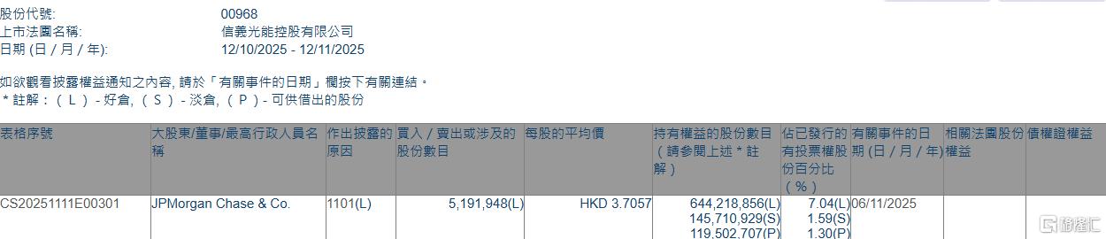 | 股份代號: | 00968 | | --- | --- | | 上市法國名稱: | 信義光能控股有限公司 | | 日期 (日 / 月 / 年): | 12/10/2025 - 12/11/202 | | 表格序號 | 大股東/董事/最高行政人員名 作出披露的 買入 / 費出或涉及的 每股的平均價 | | | | | 持有權益的股份數目 佔已發行的 有關事件的日 相關 | | --- | --- | --- | --- | --- | --- | --- | | | 反历模则目 | | | | 請參閱十拉*註 | 有投票權股 期(日/月/年)權益 | | | | | | | | 四三十四日 | | CS20251111E00301 | JPMorgan Chase & Co. | 1101(L) | 5,191,948(L) | HKD 3.7057 | 644.218.856(L) | 7.04(L)06/11/2025 | | | | | | | 145.710.929(S) | 1.59(S) | | | | | | | 119,502,707(P) | 1.30(P) | 格隆汇11月12日丨根据联 ...