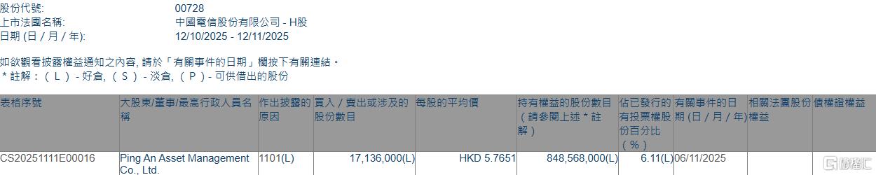 | 股份代號: | 00728 | | --- | --- | | 上市法國名稱: | 中國電信股份有限公司 - H股 | | 日期 (日 / 月 / 年): | 12/10/2025 - 12/11/2025 | | 表格序號 | 大股東/董事/最高行政人員名 作出披露的 賈入 / 南出或涉及的 每股的平均價 | | 持有權益的股份數目 佔已發行的 有關事件的日 相關 | | | --- | --- | --- | --- | --- | | | | 版 元 第 三 | (請參閱上述*註 有投票權股 期(日/月/年)權益 份自分市 | | | CS20251111E00016 | Ping An Asset Management 1101(L) | 17,136,000(L | HKD 5.7651 848,568,000(L) | 6.11(L)06/11/2025 | | | Co., Ltd. | | | | 格隆汇11月12日丨根据联交所最新权益披露资料显示,2025年11月6日,中国电信(00728.HK)获Ping An Asset Management Co., Ltd.在场内以每股均价5.7 ...