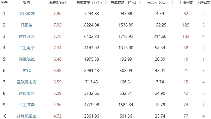 (责任编辑:马欣) | 序号 | 板块 | 涨跌幅(%)▼ | | 总成交量(万手) = 总成交额(亿元) ▼ | 净流入 (亿元) ▼ | 上涨家数 | 下跌家数 | | --- | --- | --- | --- | --- | --- | --- | --- | | 1 | 文化传媒 | 7.96 | 7244.83 | 947.88 | 4.59 | 82 | 2 | | 2 | IT服务 | 7.92 | 8224.94 | 1538.89 | 122.25 | 125 | 3 | | 3 | 软件开发 | 7.76 | 6402.23 | 1713.92 | 214.60 | 133 | র্ব | | র্ব | 军工电子 | 7.34 | 4143.92 | 1315.90 | 58.34 | 28 | ব | | 5 | 影视院线 | 6.48 | 1975.38 | 192.99 | 20.39 | 19 | 1 | | 6 | 游戏 | 5.98 | 2981.43 | 508.09 | 43.01 | 21 | 3 | | 7 | 互联网电商 | 5.59 | 713.45 | 106 ...