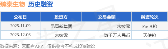 证券之星消息,根据天眼查APP于11月9日公布的信息整理,广东臻泰生物科技有限公司Pre-A轮融资, 融资额未披露,参与投资的机构包括昆高新集团。 | 公布日 | 投资方 | 交易金额 | 融资轮次 | | --- | --- | --- | --- | | 2025-11-09 | 昆高新集团 | 未披露 | Pre-A轮 | | 2023-12-06 | 未披露 | 数千万人民币 | 天使轮 | 广东臻泰生物科技有限公司是一家医美材料研发商,现阶段臻泰生物的研发管线主要包括:柠檬酸材 料、柠檬酸材料与胶原蛋白等复配产品、牛跟腱提取胶原蛋白、重组胶原蛋白等。 数据来源:天眼查APP 以上内容为证券之星据公开信息整理,由AI算法生成(网信算备310104345710301240019号),不构成 投资建议。 ...