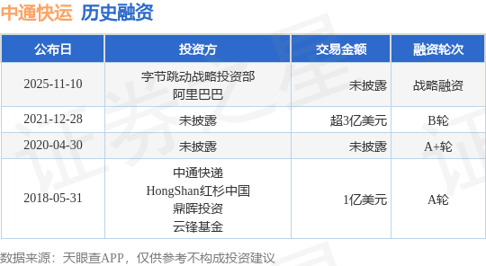证券之星消息,根据天眼查APP于11月10日公布的信息整理,中通供应链管理有限公司战略融资,融资 额未披露,参与投资的机构包括字节跳动战略投资部,阿里巴巴。 | 公布日 | 投资方 | 交易金额 | 融资轮次 | | --- | --- | --- | --- | | 2025-11-10 | 字节跳动战略投资部 阿里巴巴 | 未披露 | 战略融资 | | 2021-12-28 | 末披露 | 超3亿美元 | B轮 | | 2020-04-30 | 未披露 | 末披露 | A+轮 | | 2018-05-31 | 中通快递 HongShan红杉中国 | 1亿美元 | A轮 | | | 鼎库投资 | | | | | 云锋基金 | | | 中通快运是中通集团旗下的零担物流品牌,我们运营"中心直营+加盟网点"的"扁平化"管理模式,综 合"业务数据化、数据业务化"的绩效渐进考核体系,力争在最短的时间内,采用现代化的作业设备、信 息化管理系统以及全国统一高标准的作业流程,全程全网上下一体,创建一流"大众创业、万众创新"的 物流供应链管理服务平台。 数据来源:天眼查APP 以上内容为证券之星据公开信息整理,由AI算法生成 ...