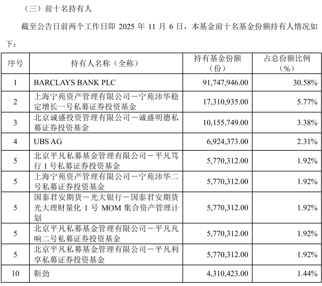 来源:市场资讯 (来源:基民柠檬) 华夏基金和易方达基金旗下的"巴西ETF",2025年11月13日上市交易。 抢着认购 2025年10月31日,华夏布拉德斯科巴西伊博维斯帕ETF(QDII)和易方达伊塔乌巴西IBOVESPA ETF(QDII)仅募集一天,均设置3亿元募集上限。 虽然2只"巴西ETF"没有什么宣发,但是均有着不错的市场热度,易方达基金旗下的巴西ETF(520870)配售比例11.823%,华夏基金旗下的巴西ETF (159100)配售比例11.53867900%,比例很是接近。 巴西ETF(520870)认购户数12313户,巴西ETF(159100)认购户数9081户,户均认购申请金额少的也有20多万,多的接近30万元。 这个募集情况是相当不错! 出乎意料的认购大户 2只"巴西ETF"的上市交易书披露了前十名持有人情况,先来看华夏基金巴西ETF(159100)的: | 序号 | 持有人名称(全称) | 持有基金份额 | 占总份额比例 | | --- | --- | --- | --- | | | | (份) | (%) | | 1 | BARCLAYS BANK PLC | 91,747, ...