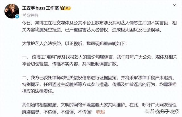 事件概述 - 男星王安宇工作室于1月3日早晨发布声明,否认与女星关晓彤的恋情传闻,称相关言论为凭空捏造的不实谣言,已严重侵害艺人名誉权并造成社会误导 [1] - 声明中表示已委托律师对侵权信息进行证据固定,并将采取法律手段追责,同时呼吁公众及媒体切勿轻信和传播不实内容 [2] 传闻起源与内容 - 2日深夜,博主“司晓迪”在社交媒体爆料,称关晓彤与包括鹿晗、林更新、檀健次、黄明昊、周奇在内的众多男艺人恋爱 [4] - 该博主还在粉丝群中具体爆料,称王安宇与关晓彤正在恋爱中 [4] 相关艺人背景与关系 - 关晓彤是中国内地女演员、歌手,出生于1997年,毕业于北京电影学院 [4] - 关晓彤与鹿晗于2017年10月8日公开恋情,至事件发生时已近八年 [4] - 2025年9月17日关晓彤生日及鹿晗35岁生日时,双方首次未公开互送祝福,打破了连续7年卡点庆生的惯例,此前已多次传出分手传闻但双方均未回应 [4] - 王安宇出生于1998年,于2019年主演古装剧《梦回》正式出道,曾主演《二十不惑》《炽道》等电视剧 [6] - 关晓彤与王安宇曾合作电视剧《小巷人家》,部分观众因剧中演绎产生代入感,但二人互动仅限于工作合作,王安宇曾公开表示“很久未见关晓彤” [8] 其他相关方回应 - 鹿晗工作室于1月3日稍早连发两条回应,称对于鹿晗私生活的大规模造谣与诽谤已固定证据并进入法律程序,呼吁网友停止传播并删除不实信息 [8] - 林更新工作室于1月3日早晨发文,表示已对各平台不实信息取证并委托律师处理,同时提及爆料博主“iamroosie”女士 [9]