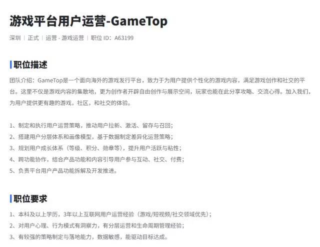 公司战略与业务布局 - 公司计划在海外市场推出名为GameTop的全新游戏发行平台,该平台将整合游戏内容分发、创作工具支持与玩家社交功能[1] - 此次海外平台布局标志着公司在海外游戏发行领域的战略深化,是其游戏业务战略调整后在海外市场的重要动作[1] - 2024年4月,公司对游戏业务进行重大战略优化,业务发展路径从此前的“高举高打”转向“大发行小自研”的务实策略[4] - 公司游戏业务已形成多品类产品储备,旗下工作室正积极探索AI技术与游戏研发的融合创新,多款涵盖射击、卡牌、动作等主流类型的新游戏处于待发行阶段[4] 平台运营与团队建设 - GameTop平台定位为面向海外用户的综合性游戏服务平台,核心目标是为用户提供个性化游戏内容推荐,同时满足游戏创作者的工具需求与玩家的社交互动需求[3] - 公司已正式启动GameTop平台的运营团队招聘工作,招聘岗位聚焦用户运营核心能力,包括制定并执行用户拉新、激活、留存及召回全链路策略[3] - 运营工作还包括搭建用户分层体系与画像模型,基于数据驱动实现差异化运营,并设计涵盖等级、积分、勋章等激励机制的成长体系以提升用户活跃度与粘性[3] 组织架构与资源整合 - 2024年5月任命前完美世界游戏业务总裁张云帆全面负责游戏板块,推动公司游戏业务完成资源整合,将沐瞳科技、朝夕光年及UGC相关部门纳入统一管理体系[4] - 资源整合后集中资源投向产品研发与精细化运营,强调项目管理中效率与质量的平衡[4] - 在投资收购方面,公司秉持“精准补位、协同发展”原则,2024年先后收购金华市乐鸿网络科技有限公司、云游网(北京)科技发展有限公司,获得成熟休闲游戏产品线[5] - 沐瞳科技也通过收购杭州心光流美部分团队与资产,进一步强化在射击品类游戏研发领域的核心能力[5] 现有业务与市场表现 - 在国内市场,公司游戏业务保持稳定发展态势,由朝夕光年代理发行的《初音未来:缤纷舞台》国服运营表现平稳[5] - 江南工作室研发的UGC平台项目《代号:Atom》聚焦轻量化创作与强社交属性,目前已进入谨慎测试阶段[5] - 沐瞳科技研发的《决胜巅峰》手游于2025年1月在国内上线后,凭借良好市场表现进一步推动公司在国内电竞领域的布局速度[5]