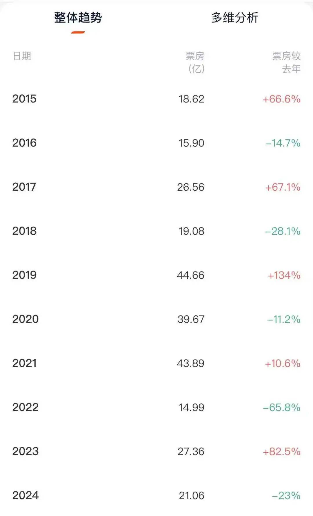 国庆档以18.35亿票房、5007万观影人次的成绩结束了转瞬即逝的8天假期,和渐冷的天气一样,整个电影市场带着一丝寒意。 相比去年同期的21亿,今年国庆档缩水了接近3亿,而历数过去十年(2015年至2024年),最差的成绩也不过是2016年的15.9亿和2022年的14.99亿,虽然 电影市场已经习惯了始终处于波动中、未形成稳步增长的健康曲线,但今年的票房与观影人次再次回到低谷,还是给重建中的电影市场蒙上乌云。 | 整体趋势 | 多维分析 | | | --- | --- | --- | | 日期 | 票房 | 票房较 | | | (亿) | 去年 | | 2015 | 18.62 | +66.6% | | 2016 | 15.90 | -14.7% | | 2017 | 26.56 | +67.1% | | 2018 | 19.08 | -28.1% | | 2019 | 44.66 | +134% | | 2020 | 39.67 | -11.2% | | 2021 | 43.89 | +10.6% | | 7777 | A.S.A. | -05.8%0 | | --- | --- | --- | | 20 ...