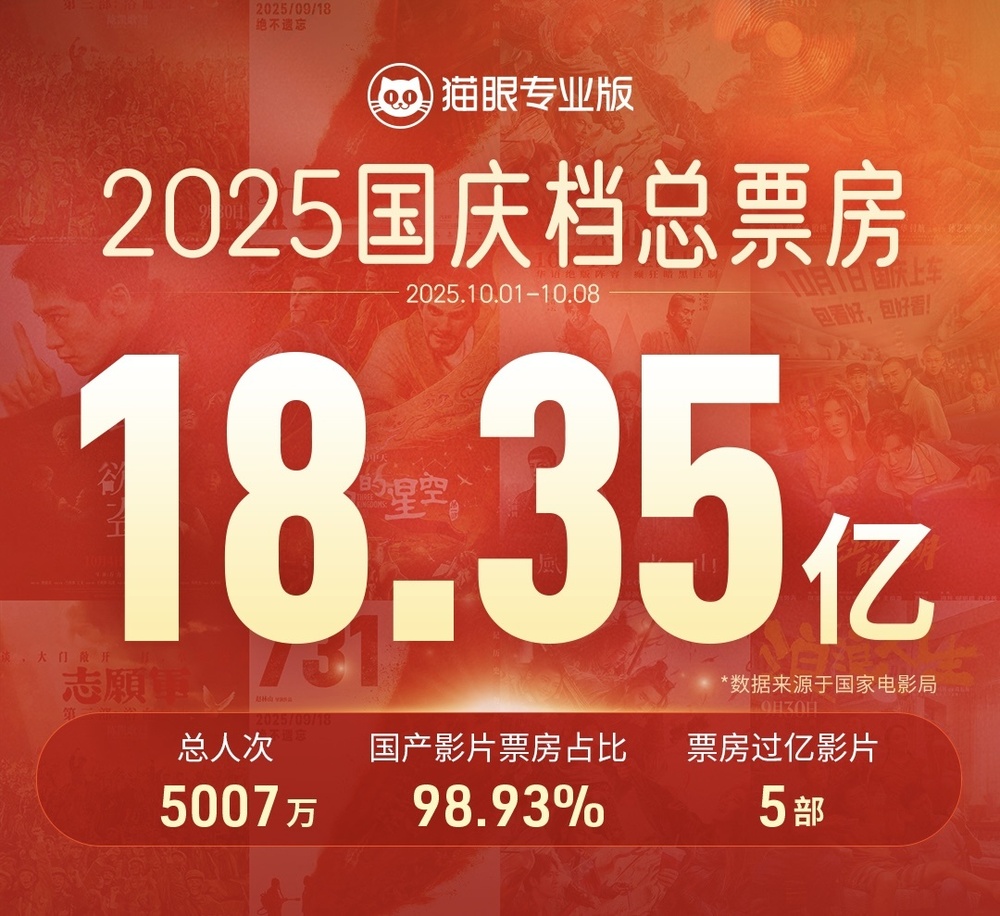 请点击上方蓝字 关注"新华网财经" 号 国家电影局10月9日发布数据 2025年国庆档电影票房 8.35亿元 2025年国庆档电影票房为18.35亿元 国家电影局10月9日发布数据,10月1日至8日,我国2025年国庆档电影票房为18.35亿元,观影人次为5007万。其中,《志愿军:浴血和平》《731》《刺 杀小说家2》《浪浪人生》《震耳欲聋》位列票房榜前五位。 整体来看,今年国庆档主旋律影片领跑,题材类型多元,满足了不同年龄、不同偏好观众的需求,持续丰富假期文化生活。 身份证换证高峰来了!最全攻略→ 来源:新华社(记者:邢拓、白瀛;海报制作:苗夏阳) 关注" 新华网财经 "视频号 更多财经资讯等你来看 往期推荐 总票房,突破50亿! N # 啊 _ | ■ i ...