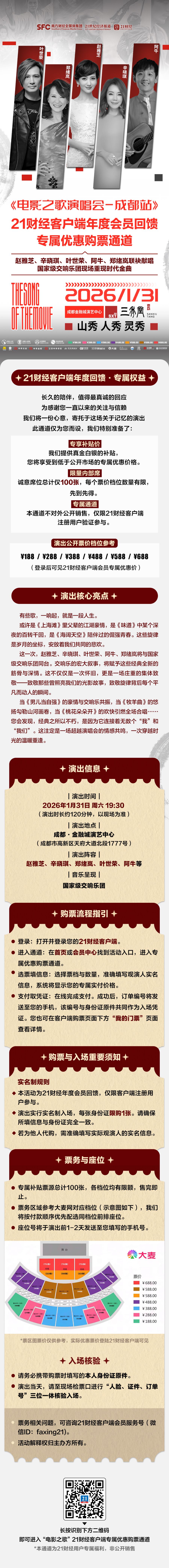 事件概述 - 21财经为其客户端用户提供一场名为“电影之歌演唱会-成都站”的专属优惠购票通道,作为年度会员回馈活动[5][13][15] - 演出将于2026年1月31日19:30在成都金融城演艺中心举行,时长约120分钟[3][20][21] - 演出阵容包括赵雅芝、辛晓琪、叶世荣、阿牛、郑绪岚,并由国家级交响乐团伴奏[4][13][21] 活动性质与定位 - 该活动并非简单的经典歌曲重现,而是通过国家级交响乐团的宏大编配,重新演绎经典电影金曲,旨在提供一次情感共鸣与集体记忆的沉浸式体验[4][6][19] - 活动定位为21财经客户端用户的专属福利,是公司对长期读者的一种感性回馈和真诚邀请,而非公开销售[5][9][15] - 活动强调“不追求规模”,旨在打造一次小范围、真诚的邀请[11] 票务与销售策略 - 公司提供专属补贴,用户通过通道看到的价格将明显低于市场公开价[11][15] - 专属补贴票源总计仅100张,各票价档位数量有限,售完即止[11][15][24] - 购票通道不对外公开,仅限通过21财经客户端验证身份的注册用户参与[9][11][23] - 演出实行实名制购票与入场,每张身份证限购1张,需进行人脸、证件、订单号三位一体核验[25][27] 票价与座位信息 - 演出公开票价档位参考为188元、288元、388元、488元、588元、688元[16][17] - 专属通道内的实际优惠票价需登录21财经客户端方可查看[24][27] - 座位将按付款顺序优先配选同档位前排座位,座位号将于演出前1-2天发送至购票人手机[24] 购票流程 - 用户需打开并登录21财经客户端,在首页或会员中心找到活动入口进入专属通道[22] - 在通道内选择票档与数量,并准确填写观演人实名信息,系统将显示专属实付价格[22] - 在线支付成功后,订单编号将发送至手机,该编号与身份证原件共同作为入场凭证[22]