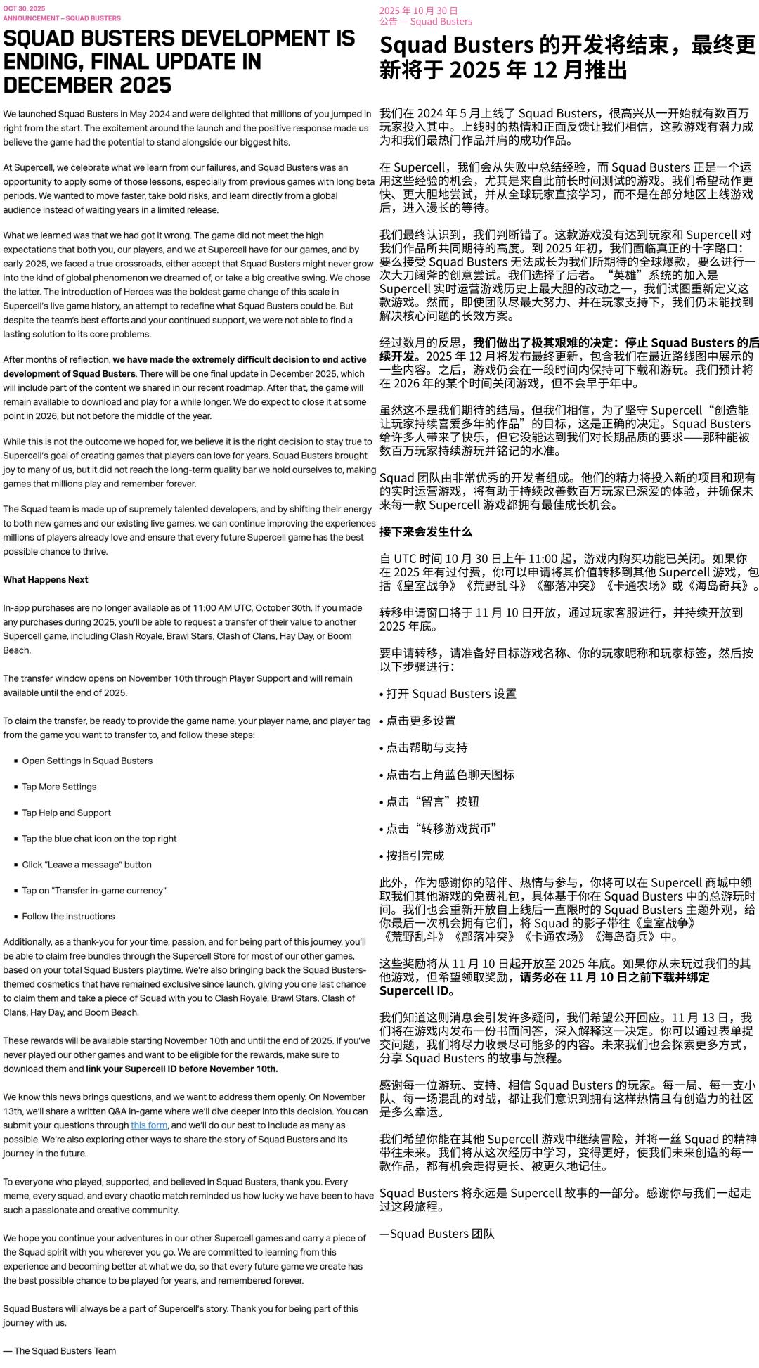 游戏停运决策 - 公司决定终止《爆裂小队》的后续开发,最终更新将于2025年12月推出,游戏预计在2026年年中之后关闭 [4][8][10] - 该决策源于游戏未能达到公司对长期品质的高标准,即创造能被数百万玩家持续游玩并铭记的作品 [1][5][10] - 自UTC时间2025年10月30日上午11:00起,游戏内购买功能已关闭,2025年的付费玩家可申请将价值转移至其他Supercell游戏 [6][12] 游戏市场表现 - 《爆裂小队》于2024年5月上线,初期即吸引数百万玩家,并曾登上美国畅销榜Top 6,但不足一年便跌出前200名 [1][9][23] - 游戏在上线前7个月内总收入超过1亿美元(约合人民币7.11亿元),并荣获Apple年度游戏奖 [27] - 国服于2025年4月限号上线,首日登免费榜Top 3,畅销榜最高Top 80,但同样快速跌出前200名 [25] 公司历史与标准 - Supercell以极度克制的产品策略著称,自2010年成立以来正式上线的产品数量稀少,但均为长青爆款,如《部落冲突》、《皇室战争》等 [22] - 在《爆裂小队》之前,公司全球上线新游戏的成功率为100%,累计收入均超过10亿美元 [23] - 公司使命是创作能让尽可能多的人玩很多年且被永远记住的伟大游戏,而非短期爆款 [27][29] 玩家补偿与过渡安排 - 玩家可于2025年11月10日至年底期间,通过客服申请将2025年游戏内付费价值转移至《皇室战争》、《荒野乱斗》等指定游戏 [6][12][14] - 作为感谢,公司将基于玩家在《爆裂小队》的总游玩时间,在Supercell商店提供其他游戏的免费礼包,并重新开放限时主题外观 [7][12] - 公司将于2025年11月13日在游戏内发布书面问答,进一步解释停运决策 [15][17] 团队调整与行业影响 - 《爆裂小队》开发团队成员将转向新项目及现有实时运营游戏,以优化现有体验并提升未来作品成功率 [6][11][20] - 公司老牌产品如《荒野乱斗》和《皇室战争》近年数据显著回暖,2024年公司全球月活跃玩家数突破3亿,收入创历史新高 [29] - 此次停运中断了公司新游戏100%成功的纪录,其下一款新品的上线时间与类型成为行业关注焦点 [22][23][29]