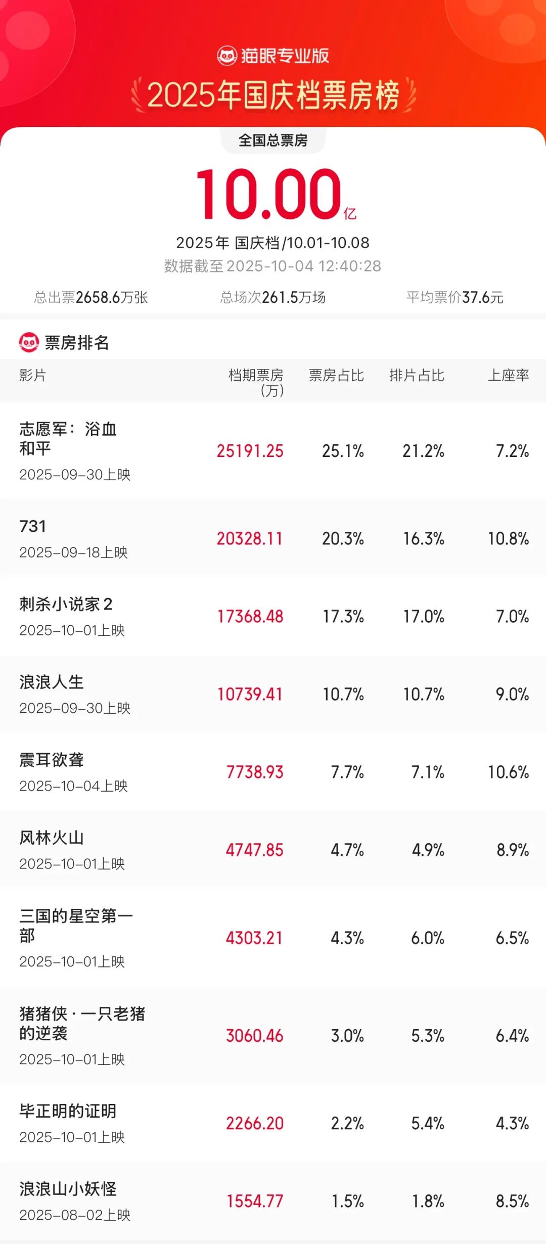2025国庆档电影票房半日破两亿 《志愿军》位列榜首
