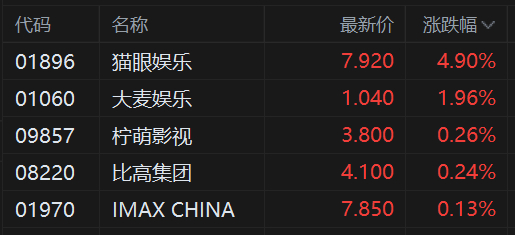 港股异动丨影视股继续上涨 猫眼娱乐录得7连升 大麦娱乐涨2% 多部大IP电影上映在即