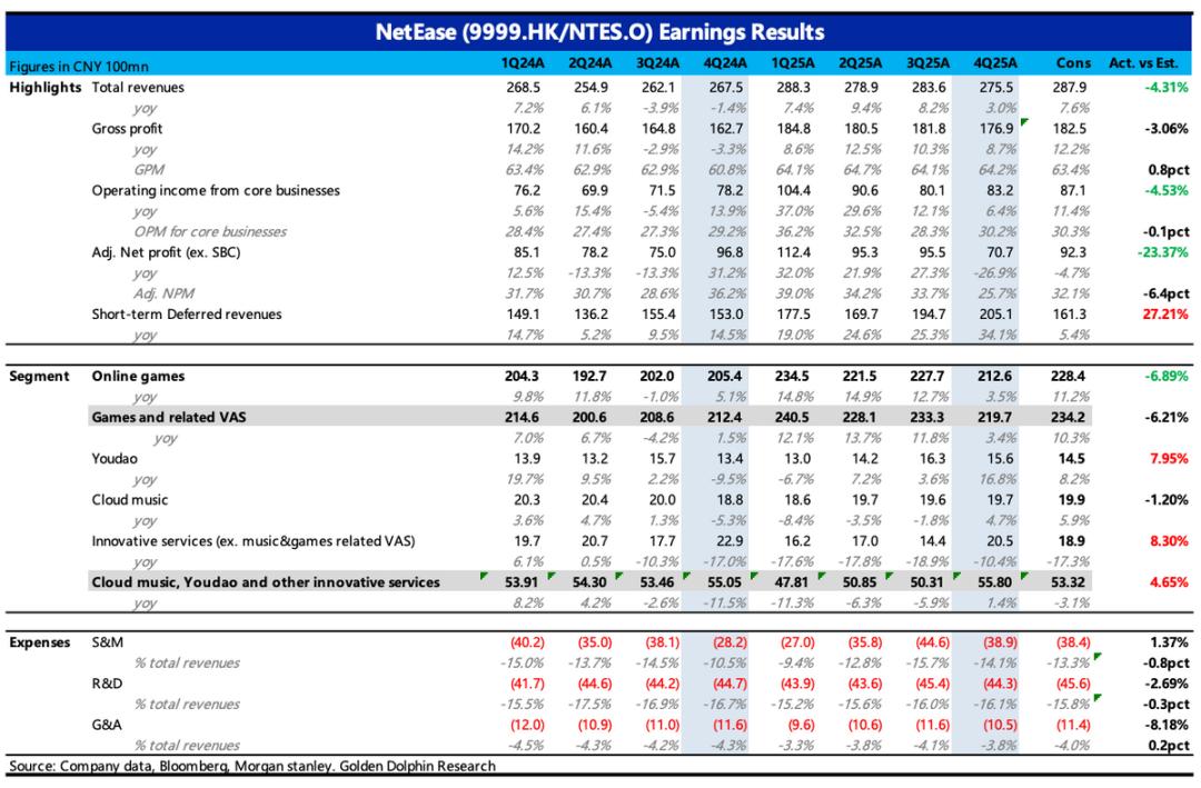 核心观点 - 网易2025年第四季度业绩低于市场一致预期,主要由于手游业务处于新游空窗期,老游戏流水下滑,导致游戏收入增长乏力 [1] - 尽管短期业绩承压,但递延收入表现强劲,为后续季度收入提供支撑,且公司严格的成本费用控制提升了核心主业盈利能力 [2][3] - 市场关注焦点在于管理层对2026年新产品周期的指引,尤其是《无限大》、《遗忘之海》等重磅新游的上线排期和流水预期 [6][25] - 对于AI(如谷歌Genie 3)可能加剧游戏行业竞争的担忧,分析认为拥有优质IP和长期运营能力的龙头公司优势将更加凸显,且中国市场的版号审批机制对供给端形成一定控制 [7][8] 财务业绩表现 - **总收入**:第四季度总收入为268.5亿元人民币,低于市场一致预期4.31% [5] - **游戏收入**:第四季度在线游戏服务收入为213亿元人民币,同比增长3.5%,显著低于市场预期 [1][10] - 游戏及相关增值服务收入为220亿元人民币 [10] - **其他业务收入**: - 有道业务收入为14.5亿元人民币,同比增长7.95% [5] - 云音乐业务收入为19.9亿元人民币,同比下滑1.20% [5] - 创新及其他业务(不含音乐及游戏相关增值服务)收入为20.5亿元人民币,同比增长8.30% [5] - **盈利能力**: - 毛利润为170.2亿元人民币,毛利率为63.4%,同比提升0.8个百分点 [5] - 核心主业经营利润为83亿元人民币,核心主业经营利润率为30%,同比提升1个百分点,环比提升2个百分点 [3][39] - 经调整净利润(加回股权激励费用)为72亿元人民币,同比大幅下降,主要因包含了拼多多持仓的投资亏损 [3][43] 游戏业务分析 - **收入疲软原因**:第四季度缺乏重磅新游上线,处于“新游空窗期”,同时多款关键老游戏流水出现下滑 [1][10] - 手游方面:《逆水寒》、《永劫无间》流水下滑,《第五人格》持续受到竞品影响 [1][15] - 端游方面:表现相对较好,《梦幻西游》畅玩服和《燕云十六声》国际服提供增量,部分抵消了《永劫无间》的热度下滑 [1][25] - **递延收入亮点**:第四季度递延收入同比增长34%,环比增长5%,表现超预期,主要得益于《燕云十六声》手游周年庆和《蛋仔派对》热度反弹带来的流水 [2][12] - 当期流水增速约为10% [12] - **未来产品管线**: - 2026年第一季度手游管线仍然匮乏,增长压力持续 [25] - 重磅新游如《无限大》(市场预期首年流水100亿元级别)和《遗忘之海》(市场预期首年流水50亿元级别)预计在2026年第二季度之后陆续上线 [25][33] - 市场期待管理层在电话会中对新游上线排期给出清晰指引 [6][25] 成本费用与现金流 - **成本费用控制**:在收入承压背景下,公司通过收缩支出来提升利润率 [3] - 第四季度成本、研发费用和管理费用均同比下滑 [3][41] - 销售费用同比高增长,主要因上年同期基数低(反腐影响)及本季度有新游戏上线进行必要宣发 [3][41] - **现金流与股东回报**: - 第四季度末公司净现金为1635亿元人民币(约234亿美元) [46] - 第四季度计划派息约50亿元人民币,分红率超过80%,属于一贯的年底特殊分红 [3] - 2025全年股东回报(实际回购额+计划派息额)总计20亿美元(141亿元人民币),占经调整归母净利润的40%,对应约782亿元市值,全年股东回报收益率约为2.5% [4][46] 行业与竞争环境 - **AI对行业的影响**:谷歌Genie 3等AI工具引发市场对游戏供给大增、竞争加剧的担忧 [7] - 分析认为,当前AI工具在可玩性和经济性上远不能独立满足正常游戏开发需求 [7] - 在供给可能增加的背景下,拥有“优质IP+长期运营能力”的公司将因新品成功率和老款流水确定性更高而显得稀缺 [7] - 腾讯和网易等龙头公司早已转向“游戏精品化”路线,其优势在AI赋能下可能进一步放大 [8] - **中国市场特殊性**:版号审批机制虽然松绑,但总量是在一定控制下缓慢爬升,对游戏供给端形成调节 [8]
