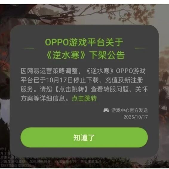 本文字数:1522,阅读时长大约2分钟 作者 | 第一财经 刘晓洁 近日,不少网友在社交媒体发帖反映OPPO渠道服多款网易游戏停服,一些玩家因此受到一些影响。 以《逆水寒》手游公告为例,显示"因网易运营策略调整,《逆水寒》OPPO游戏平台已于10月17日 停止下载、充值及新注册用户"。 第一财经记者联系OPPO官方客服,对方同样回复称是"网易运营策略调整",并建议转至官方服务 器。对于后续是否还会和网易合作,客服表示"目前暂时无法得知,没有收到通知"。 第一财经就此向网易和OPPO方面寻求更多回应,截至发稿双方都未予置评。 网易已经有多款游戏宣布下架OPPO渠道服。去年11月,网易旗下的《阴阳师:妖怪屋》曾发布 OPPO渠道版本停运公告,随后《阴阳师:百闻牌》《永远的7日之都》等多款网易游戏纷纷跟进。 2025.11. 05 进入2025年,又有多款游戏相继在OPPO停服。8月,《梦幻西游》《率土之滨》两款王牌产品依 次宣布退出OPPO平台;9月,《光·遇》《明日之后》《大话西游》等热门手游也相继发布公告, 宣布停止OPPO渠道服版本运营。10月,《逆水寒》手游、《实况足球》也加入了这一行列。 也有小道消息称 ...