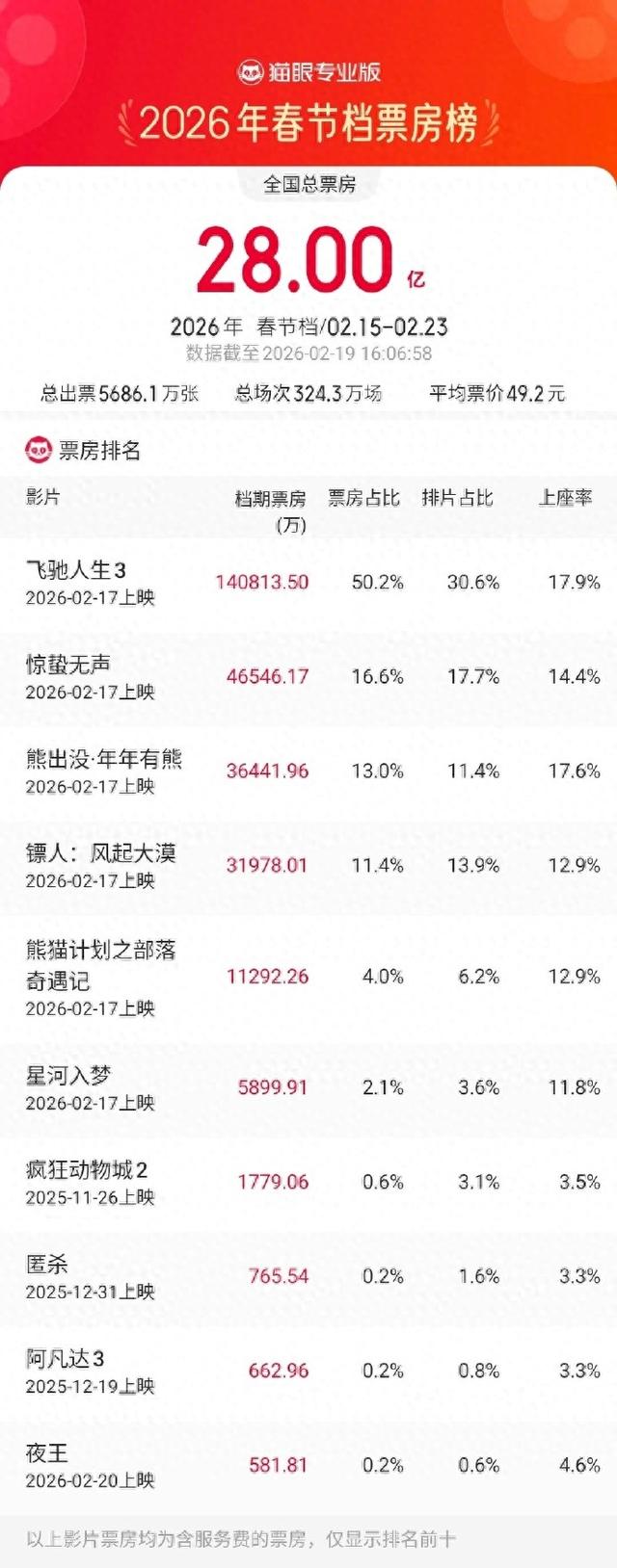 2026年春节档档期总票房破5亿,《飞驰人生3》独占2亿