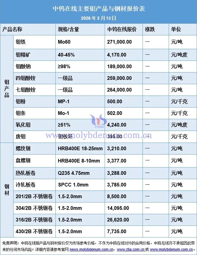 国内钼市场行情 - 2026年1月14日,国内钼市整体呈现承压下降态势,主要原因是钢招量价齐降、供应商获利了结情绪增加、国际钼市行情偏弱以及业者对后市信心不足 [1][7] - 短期市场关注焦点在于春节前下游的询盘采购情况与钼矿山企业的出货动态 [1][7] 钼精矿市场 - 钼精矿(规格40-45%)报价为3,990元/吨度,价格下降130元/吨度 [1][6] - 价格下降主要由于下游询盘活跃度降低与海外钼价震荡走低,导致供应商报价趋于谨慎 [2][7] 钼铁市场 - 钼铁(Mo60)报价为260,000元/吨,价格下降3,000元/吨 [1][6] - 市场总体行情一般,因钢企压价情绪明显与钼矿山企业报价下调,动摇了钼铁厂商挺价信心,但仍有部分钢材企业愿意进场招标 [3][7] 钼化工及制品市场 - 四钼酸铵(级品)报价为249,000元/吨,价格下降3,000元/吨 [1][6] - 七钼酸铵(级品)报价为254,000元/吨,价格上涨3,000元/吨 [1][6] - 场内购销气氛偏淡,买卖双方基本维持刚性交易,产品价格主要跟随原料端波动而被动调整,当前钼酸盐价格约降3,000元/吨 [3][8] 其他钼产品价格 - 钼酸钠(≥98%)报价为184,000元/吨,价格上涨2,000元/吨 [6] - 钼粉(MP-1)报价为483元/千克,价格持平 [1][6] - 钼条(Mo-1)报价为485元/千克,价格持平 [1][6] - 氧化钼(≥51%)报价为4,060元/吨度,价格下降130元/吨度 [1][6] 钢材市场库存 - 2026年1月上旬,21个城市5大品种钢材社会库存为711万吨,环比减少10万吨,下降1.4%,库存下降幅度收窄 [3][8] - 库存比上年同期增加48万吨,上升7.2% [3][8] - 分地区看,七大区域库存环比各有升降,华东为减量最大地区,华中为降幅最大地区 [3][8] - 分品种看,5大品种社会库存环比各有升降,线材为增幅最大品种,螺纹钢为降幅最大品种 [3][8] - 同比来看,冷轧板卷为增量和增幅最大品种,螺纹钢库存有所下降 [3][8] 钢材产品报价 - 螺纹钢(HRB400E 18-25mm)报价为3,262元/吨,价格持平 [1][6] - 盘螺钢(HRB400E 8-10mm)报价为3,434元/吨,价格持平 [1][6] - 热轧板卷(Q235 4.75mm)报价为3,312元/吨,价格持平 [1][6] - 冷轧板卷(SPCC 1.0mm)报价为3,838元/吨,价格持平 [1][6] - 201/2B不锈钢卷(1.5-2.0mm)报价为8,410元/吨,价格下降20元/吨 [1][6] - 304/2B不锈钢卷(1.5-2.0mm)报价为13,855元/吨,价格下降10元/吨 [1][6] - 316/2B不锈钢卷(1.5-2.0mm)报价为25,870元/吨,价格持平 [1][6] - 430/2B不锈钢卷(1.5-2.0mm)报价为7,645元/吨,价格持平 [1][6]