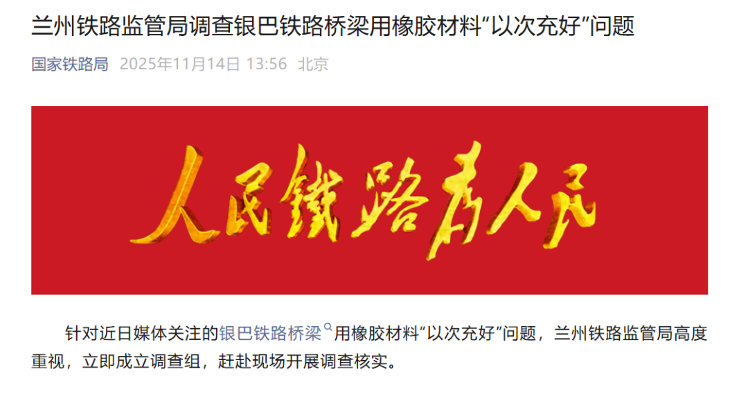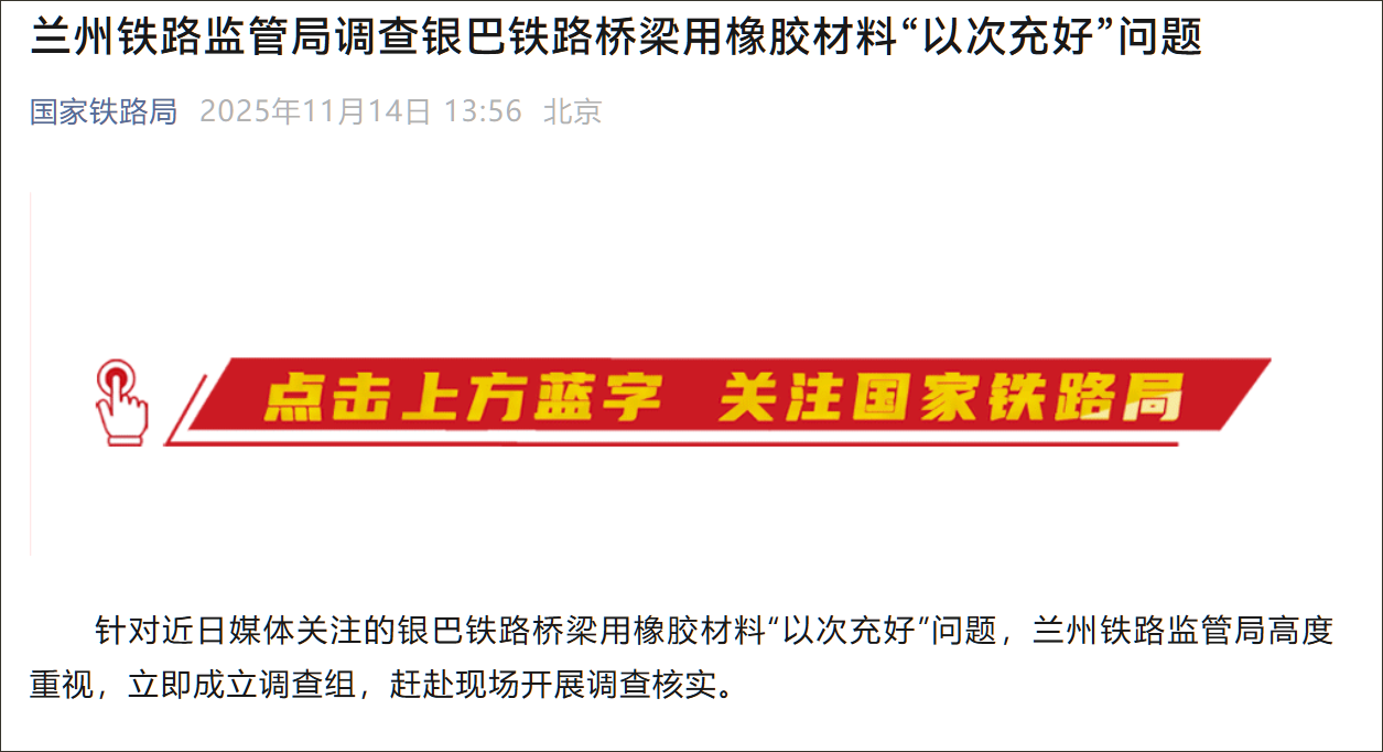银巴铁路桥梁用橡胶材料被曝“以次充好”,国家铁路局:查